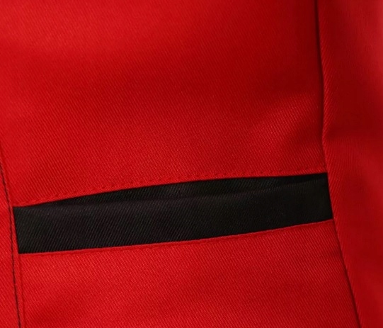 - Блейзер красного цвета с черной окантовкой на манжетах и воротнике,