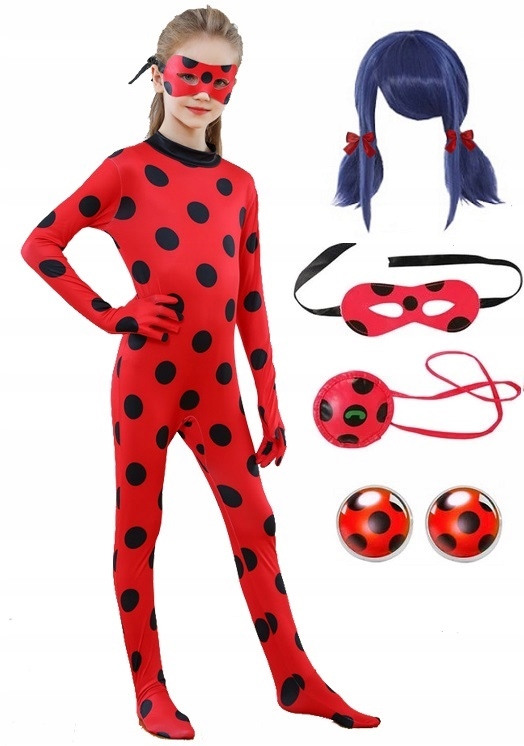 КОСТЮМ БОЖЬЕЙ КОРОВКИ С МАСКОЙ, ДЖОЖО, СЕРЬГАМИ И ПАРИКОМ, РАЗМЕР 122-128 (7-8 ЛЕТ)