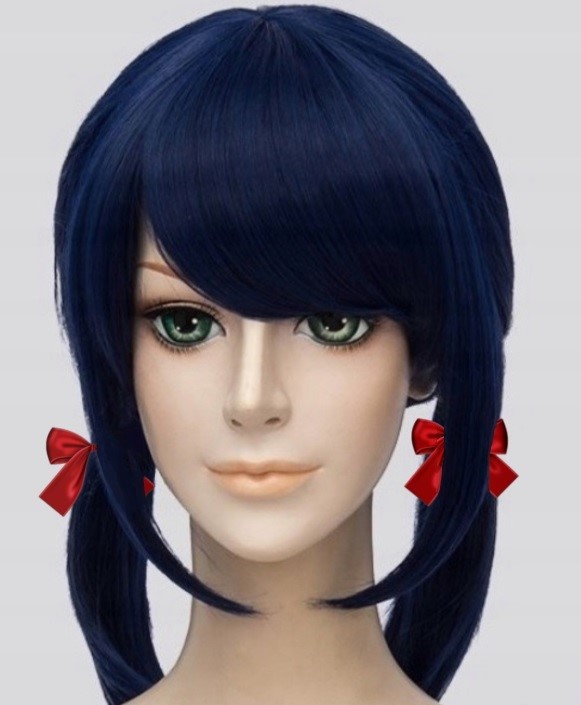 - Темно-синий парик (искусственные волосы), завязанный в два свободных хвоста с дополнительными красными лентами