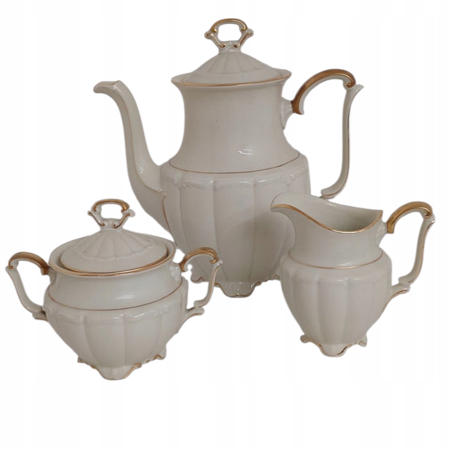 Костюм цвета экрю, размеры: высота кувшина 26см, высота молочника 13см, высота сахарницы 13см. НА САХАРНИКЕ отсутствует позолота.