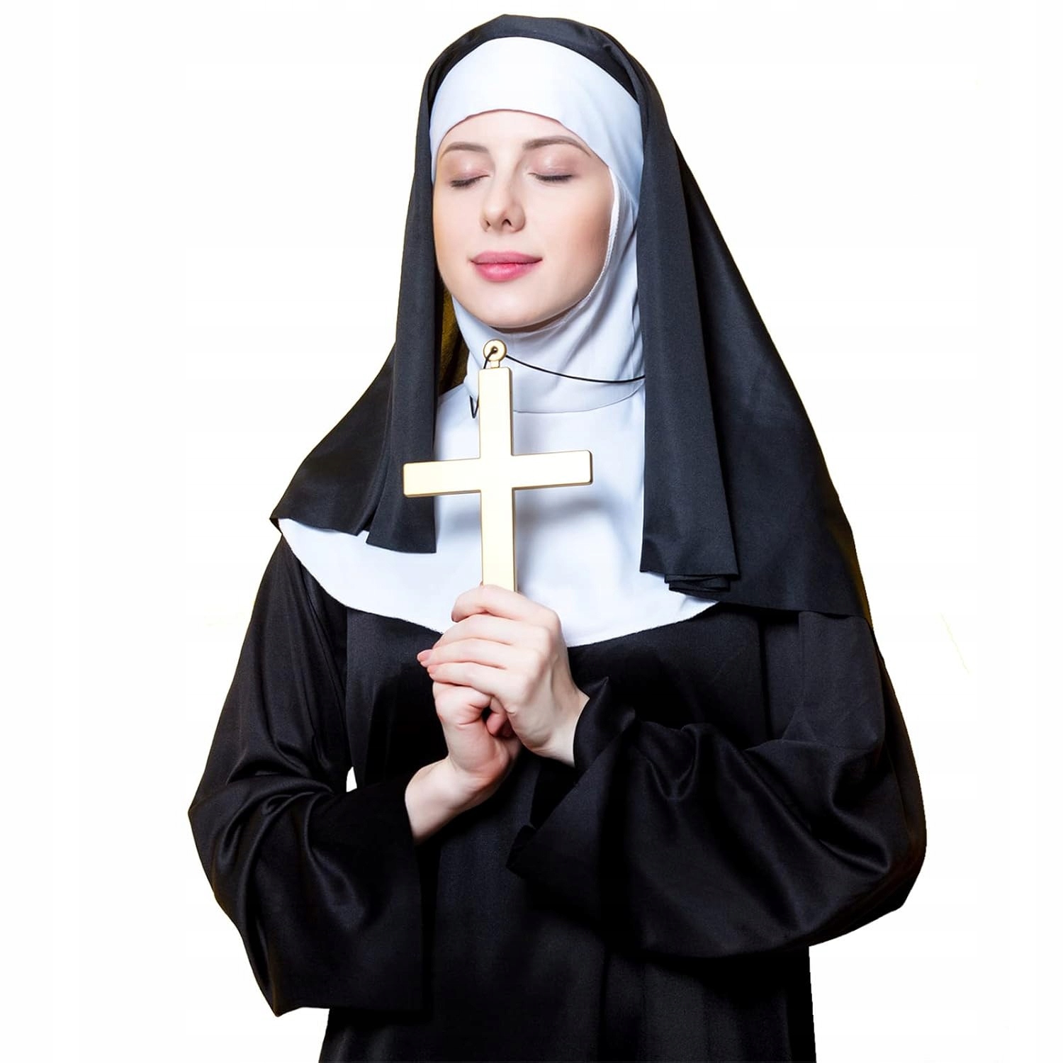 ⏩ В комплект входит классический корнет черно-белого цвета, белый воротник на шее, регулируемый галстуком, а также черные чулки, украшенные белым крестом и большим золотым крестом на шее. Все это создает эстетичную и впечатляющую маскировку, позволяющую легко взять на себя роль монахини.