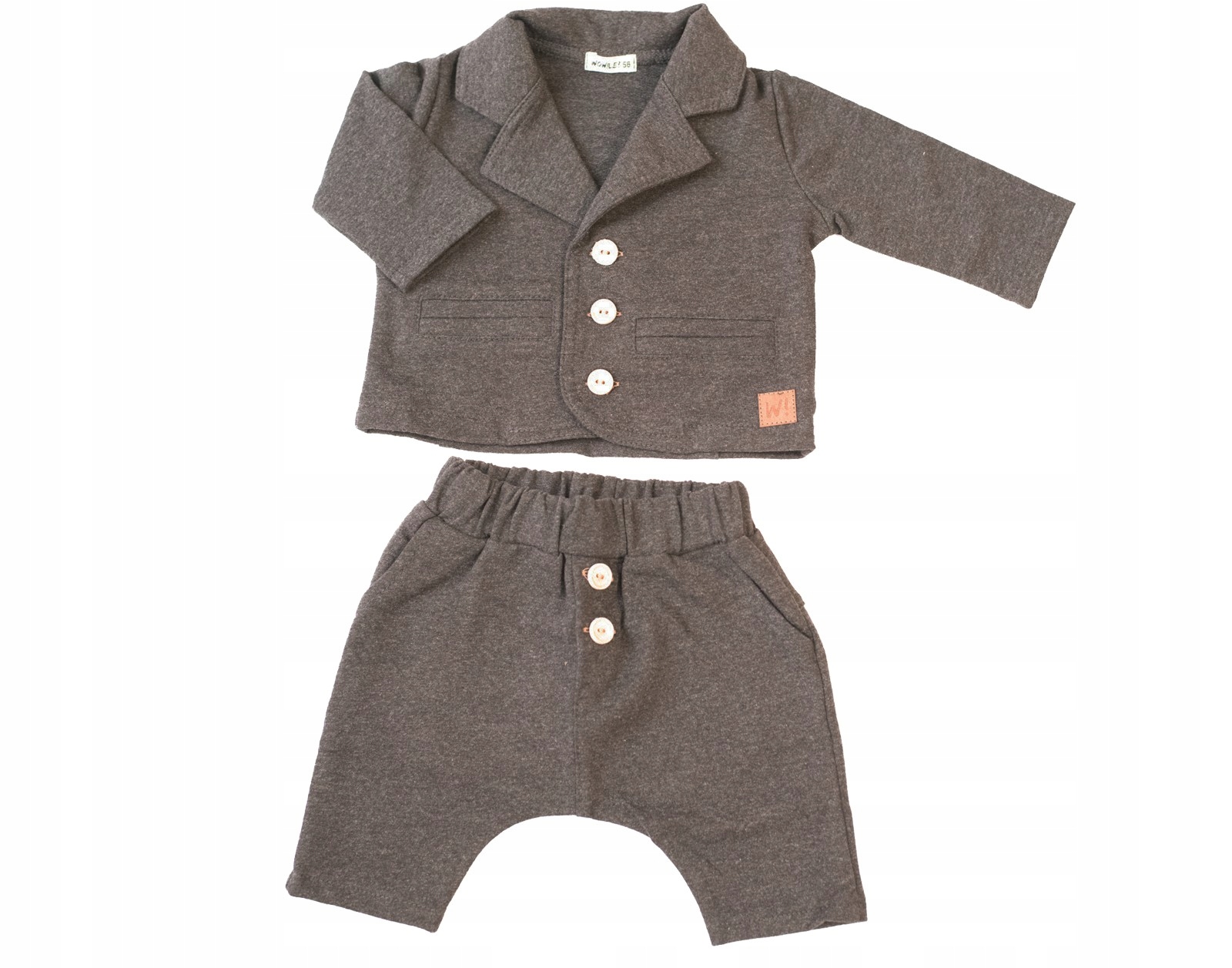 Костюм выполнен из толстовочной ткани, состоящей из 95 % хлопка и 5 % эластана. Куртка застегивается на три эко-кнопки. По бокам имитация карманов.