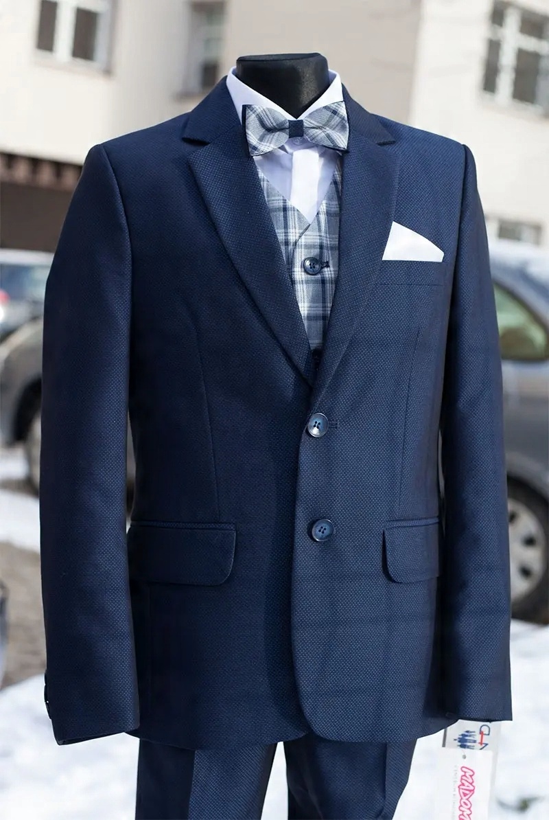 Элегантный костюм-двойка для причастия модели Enzo, идеальный для церемонии Первого Причастия. Выполнена из структурной ткани темно-синего цвета, куртка застегивается на 2 пуговицы, имеет сзади два разреза. Карман на уровне груди. Брюки имеют удобную и практичную регулировку по окружности талии (пуговицы и резинки на внутренней стороне пояса). Низ брюк не подворачивается, что позволяет легко отрегулировать их длину непосредственно перед церемонией.