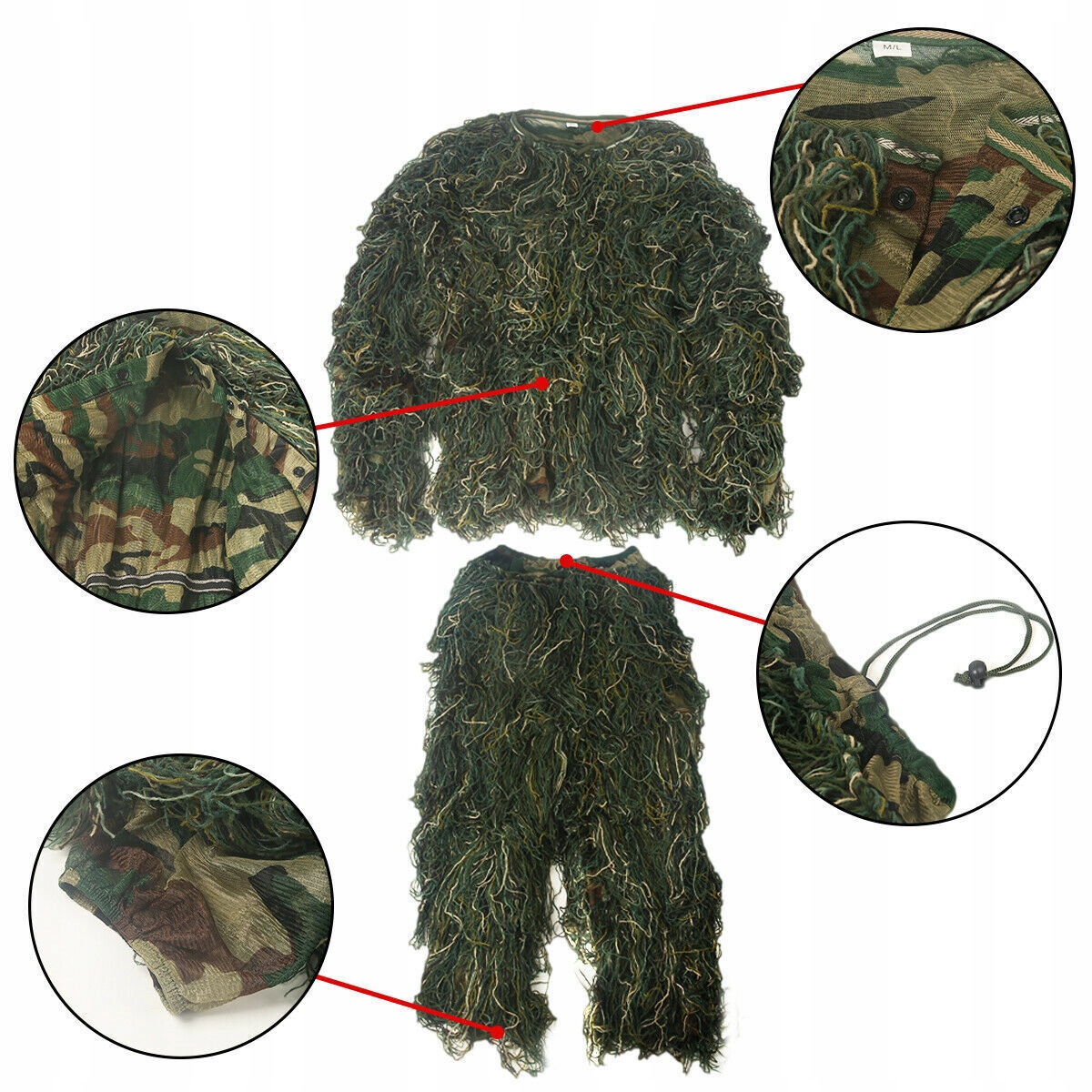 Маскировочный костюм изготовлен из удобной ткани из полипропилена и полиэстера. , с дополнительным усовершенствованным 3D-камуфляжем и концепцией имитации травы. Охотничий костюм-гилли покрыт плотными нитями, что позволяет лучше маскировать и охотиться во время страйкбола в дикой природе.