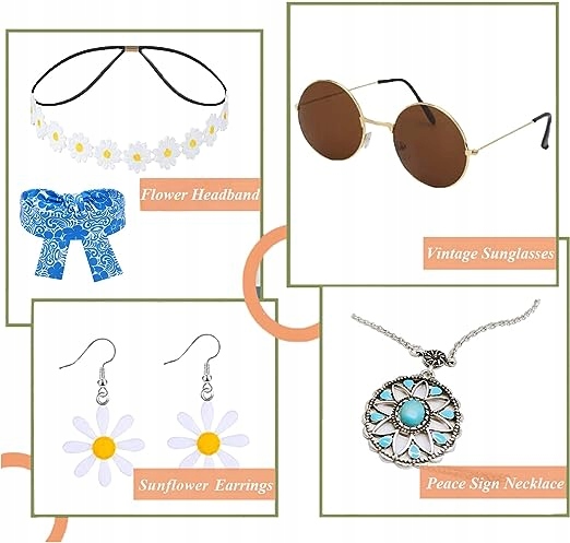 Платье хиппи 70-х годов, 1 пара сережек с цветами, 1 ожерелье со знаком мира, 1 ободок с цветком, 1 пара винтажных солнцезащитных очков. Этот комплект костюмов хиппи для женщин придаст образу хиппи вашим предстоящим костюмированным вечеринкам в стиле диско 60-х и 70-х годов.