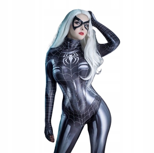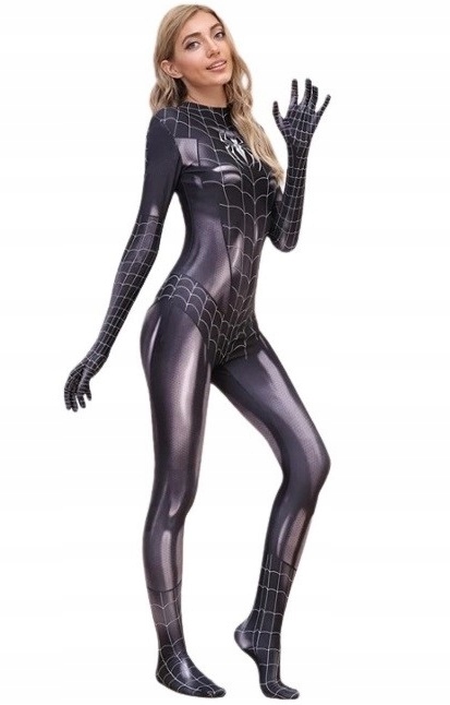 Цельный Костюм Женщины-Паука в черно-белом цвете. Хорошо сшит, слегка эластичен, застегивается на молнию. Благодаря нашему предложению каждый превратится в любимого персонажа комиксов.