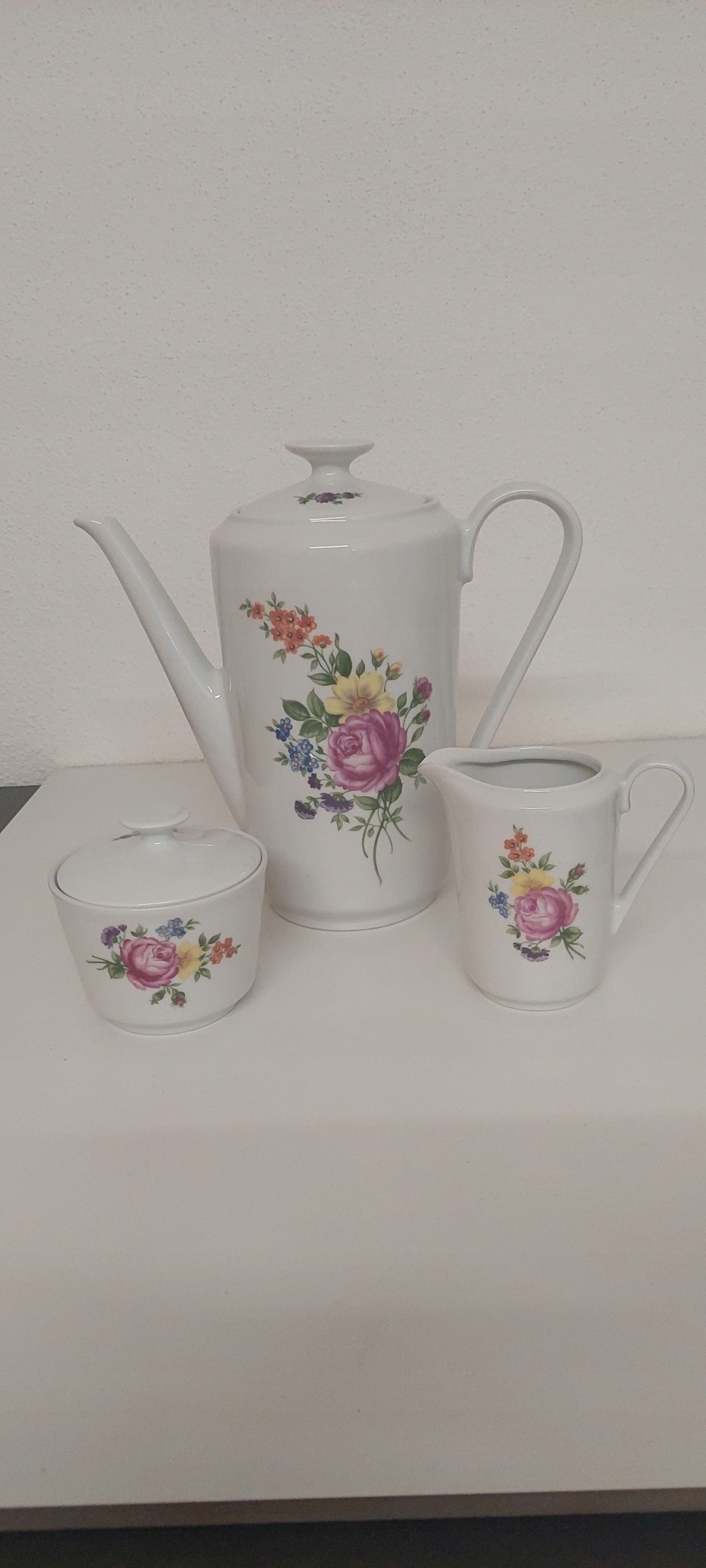 костюм в очень хорошем состоянии с размерами высоты кувшина 23 см, высота молока 10,5 см, чаши для сахара, высота 8 см, диаметр 9,5 см.