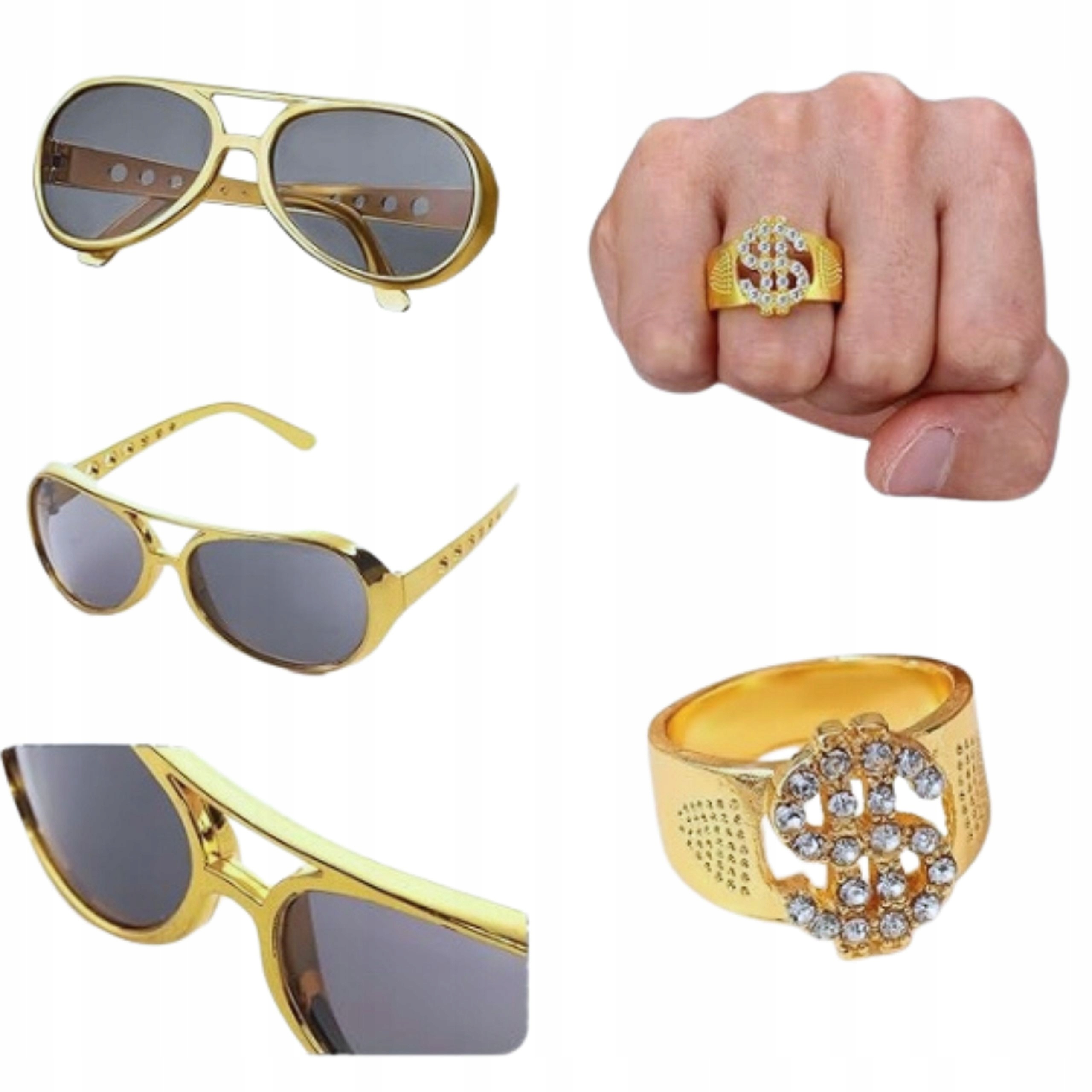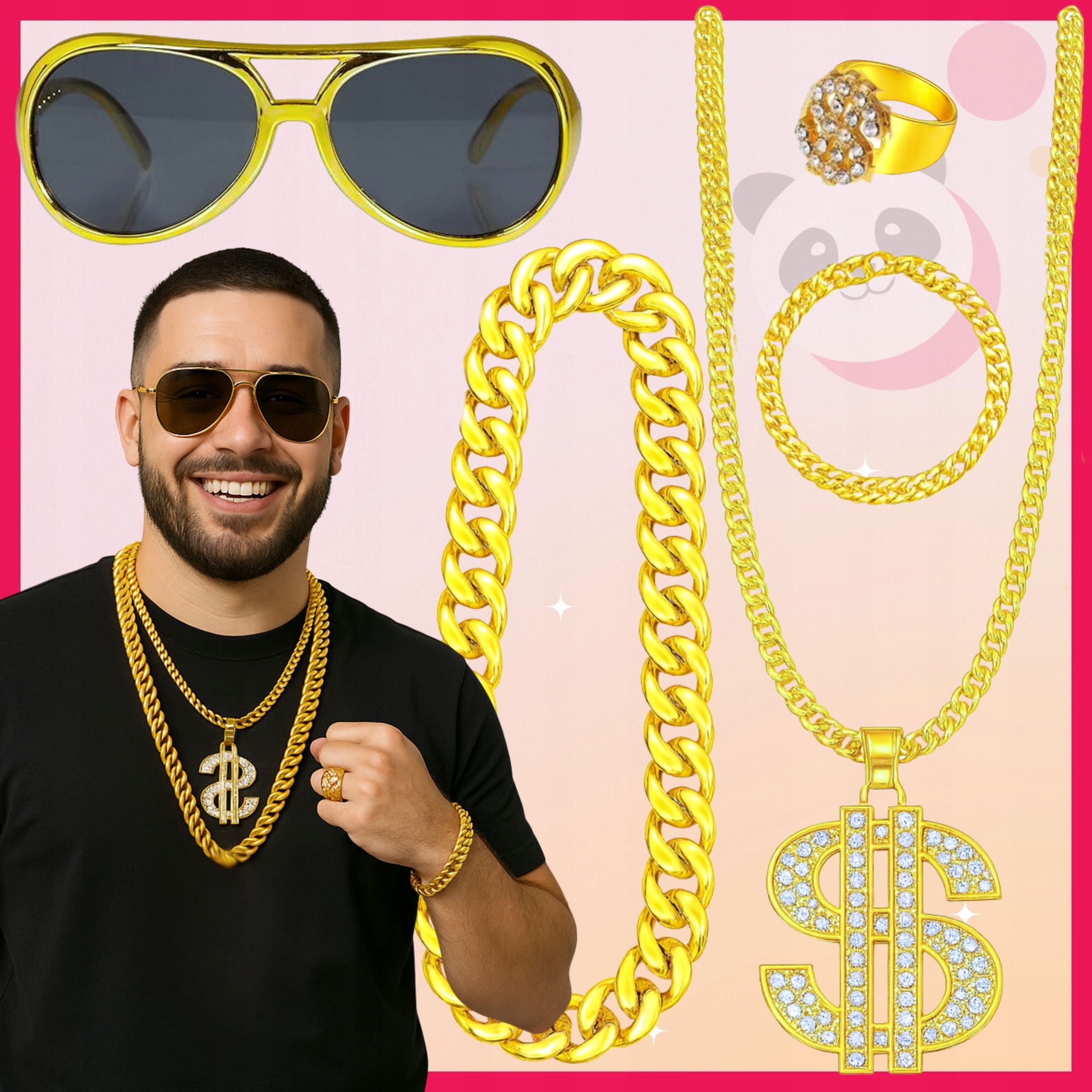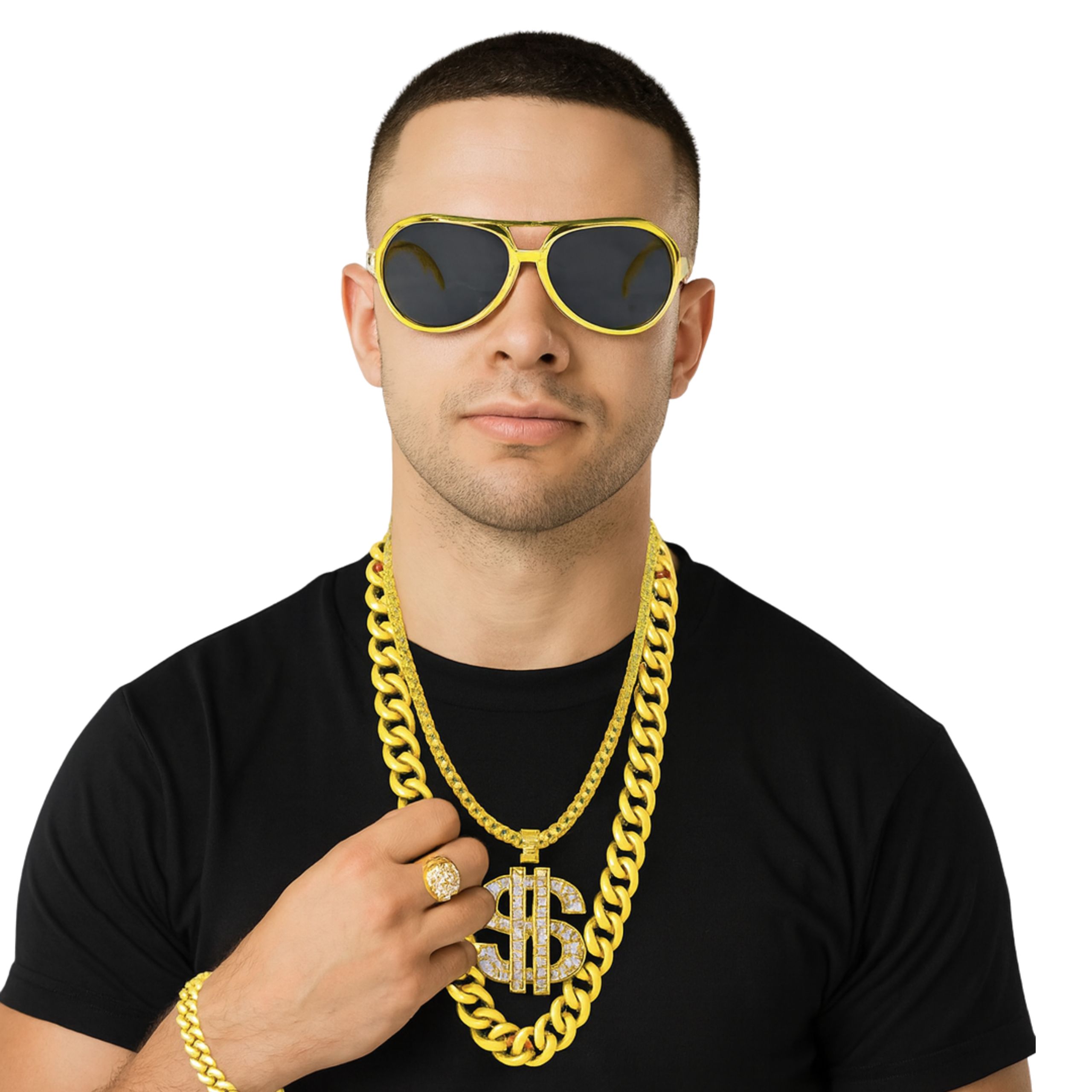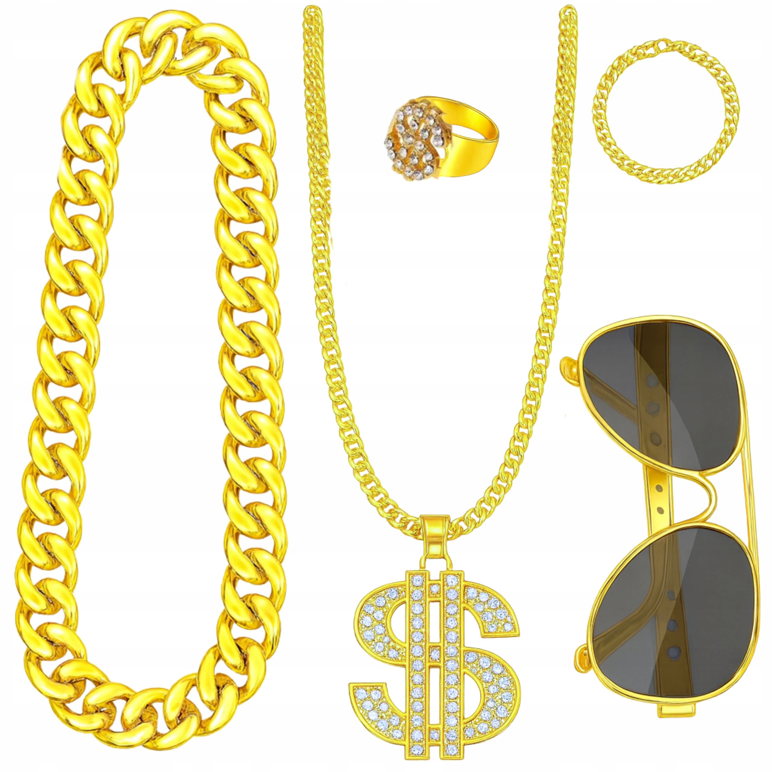 ⭐ Полный набор аксессуаров — в комплект входит все необходимое, чтобы полностью отразить стиль гангстера/рэпера: толстая золотая цепочка, перстень с печаткой, браслет и очки.