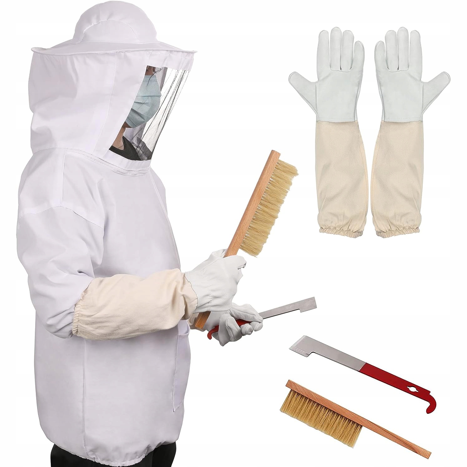 🐝Инвентарь для пчеловодства. В комплект также входят перчатки с длинными рукавами, кисть-улей и крючок J. Льняные перчатки из овчины отличного качества и долговечны. Хвостик ручки сплющен для удобного открывания улья. Улей с J-образным крюком из нержавеющей стали прочный и устойчивый к ржавчине.