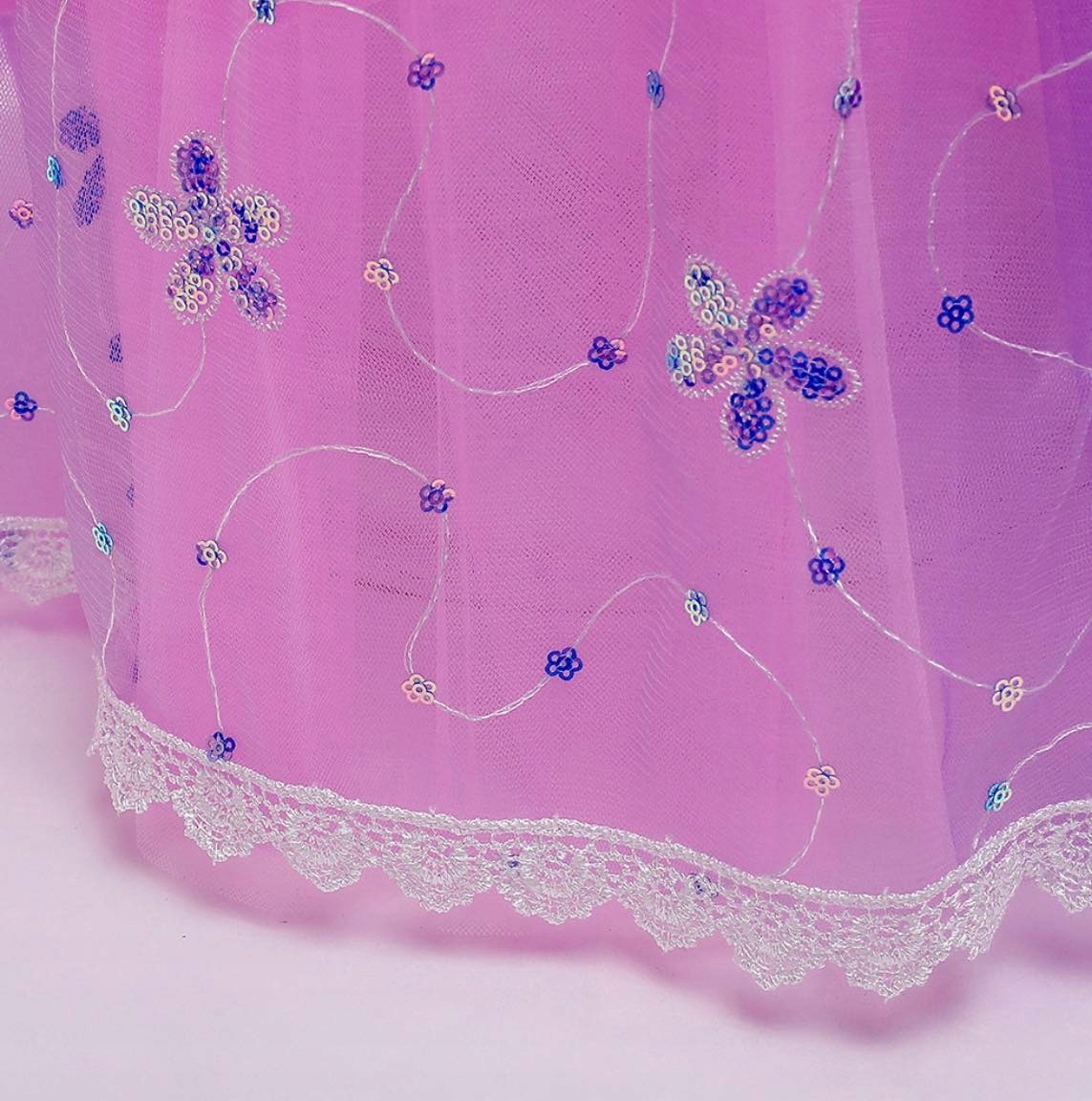 Красивое платье, верх из розовых пайеток, отделан кружевом и золотыми вставками. Платье в розовых и фиолетовых тонах. Низ платья выполнен из фатина по образцу Рапунцель из сказки «Заплатани», отделан ажурным кружевом и золотой атласной лентой, состоящей из 2 слоев атласной подкладки и 3 слоев фатина. Она прекрасно плавает во время танца. У платья очаровательные короткие рукава.