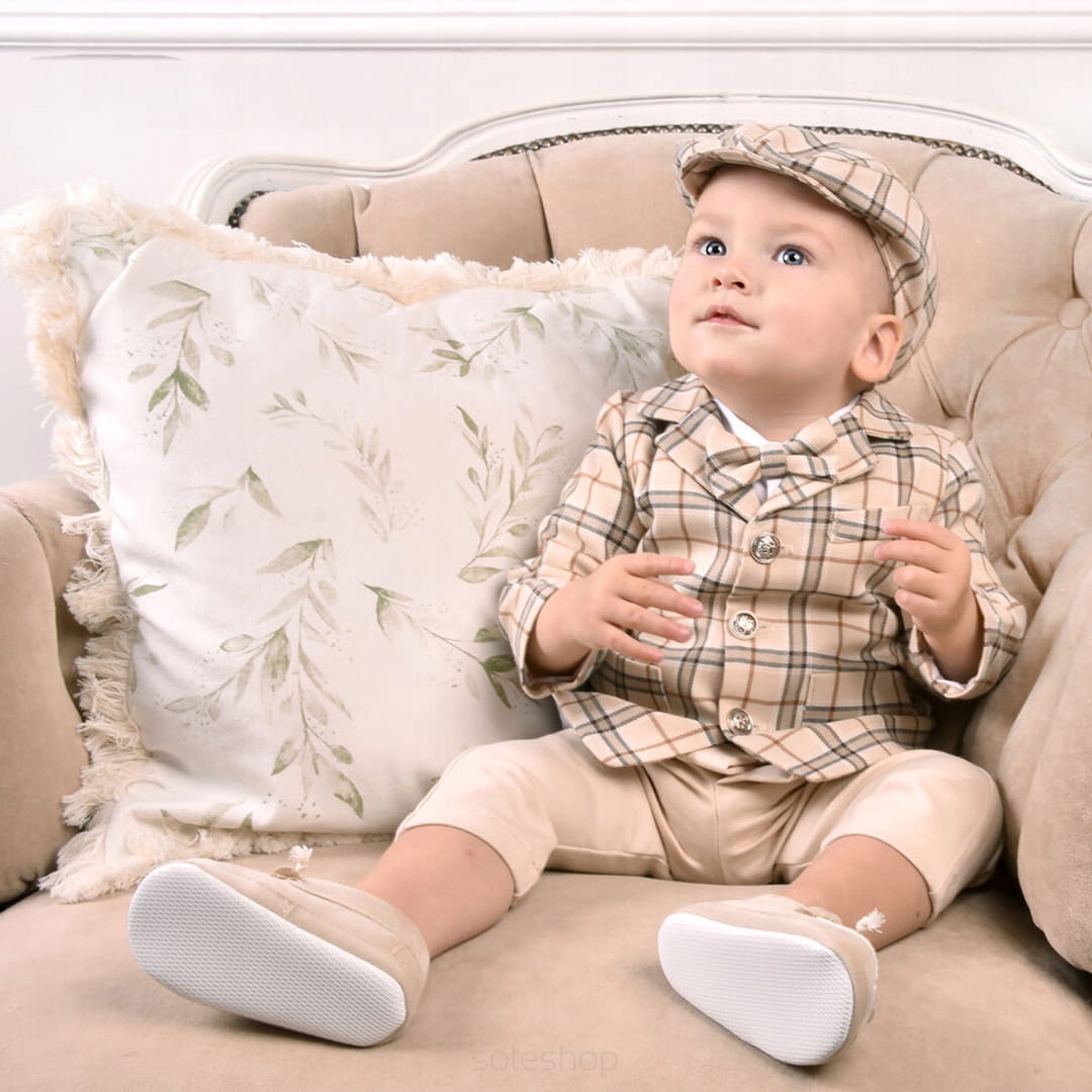 Комплект для мальчика, состоящий из рубашки-боди, брюк и аксессуаров – прекрасное предложение для маленького джентльмена на любое торжество, в том числе и на Святое Крещение. В комплект входит элегантный пиджак, удобные бежевые брюки, стильная рубашка-боди, очаровательный галстук-бабочка и очаровательная плоская кепка. Это полный набор, который подарит вашему малышу безупречный вид и чувство стиля.