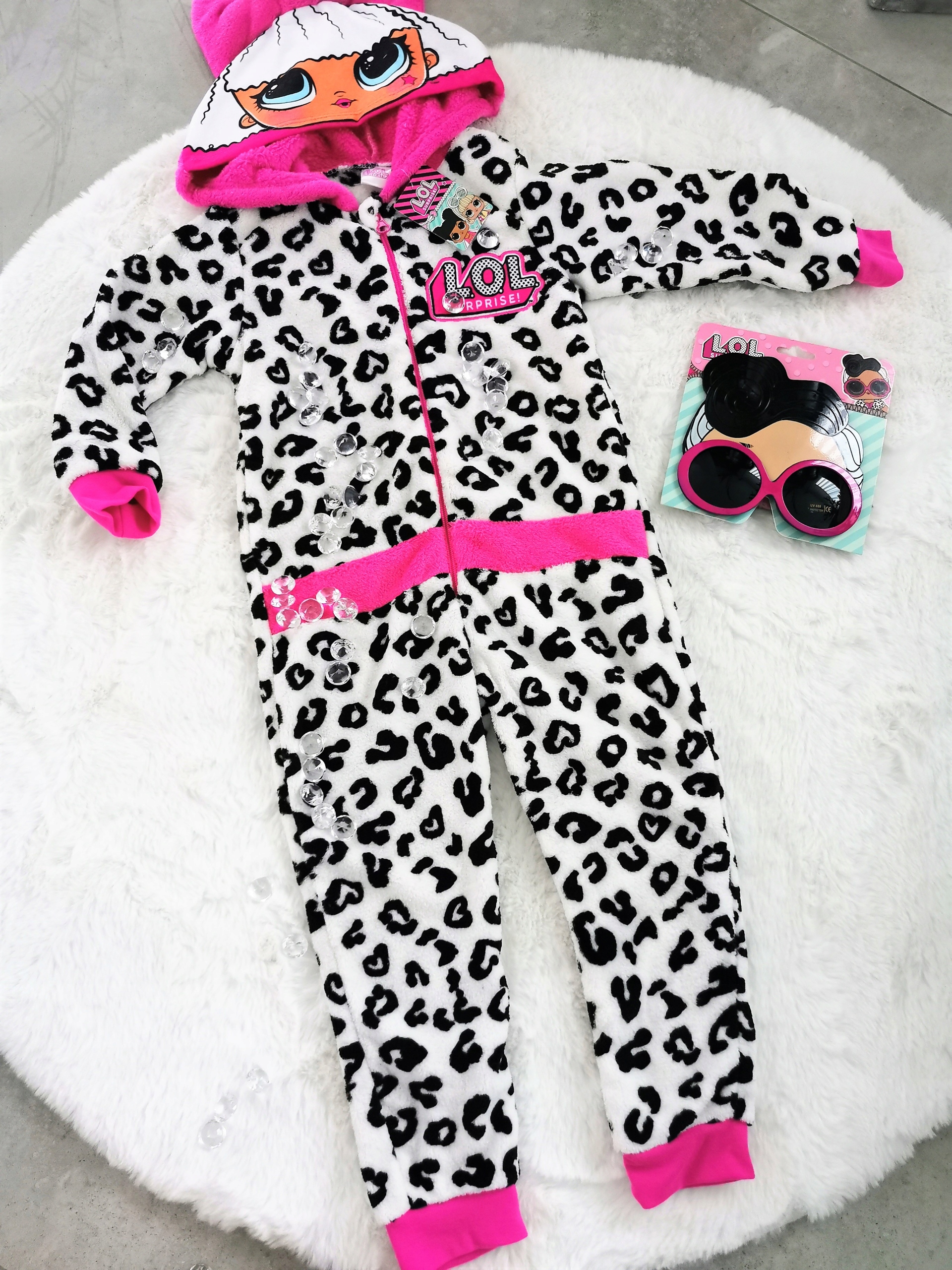 Белый, черный и розовый с аппликациями по образцу персонажа L.O.L Surprise. Капюшон с изображением ЛОЛ.