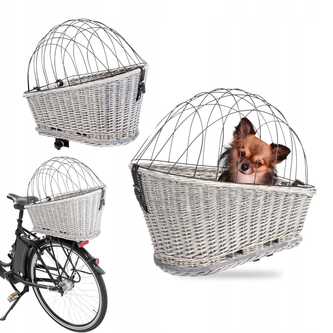 Корзина TRIXIE — удобная переноска для перевозки собаки или кошки на велосипеде, крепящаяся на багажник. Легкий и практичный. Изготовлен из лозы с металлической корзиной. С серой подушкой, имитирующей замшу.