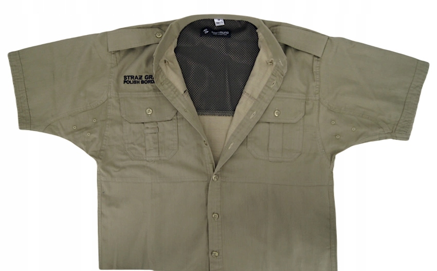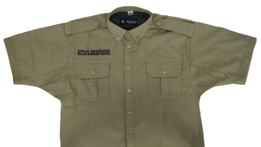Передняя часть рубашки разрезана из трех частей. Первый включает в себя воротник с плечиками и подплечниками. С правой стороны выполнена вышивка черной нитью с использованием компьютерной технологии с текстом: верхняя строка SZRŻ GRANICZNA, нижняя строка меньшим шрифтом POLISH BORDER GUARD. Эполеты вшиты в рукав и прикреплены пуговицей. Углы воротника застегиваются на небольшую пуговицу. Вторая часть содержит два кармана, застегивающихся на пуговицу. Клапаны карманов имеют скошенные углы. В середине кармана имеется складка. Также имеется петля с правой стороны. Третью отделочную деталь поместить в штаны.