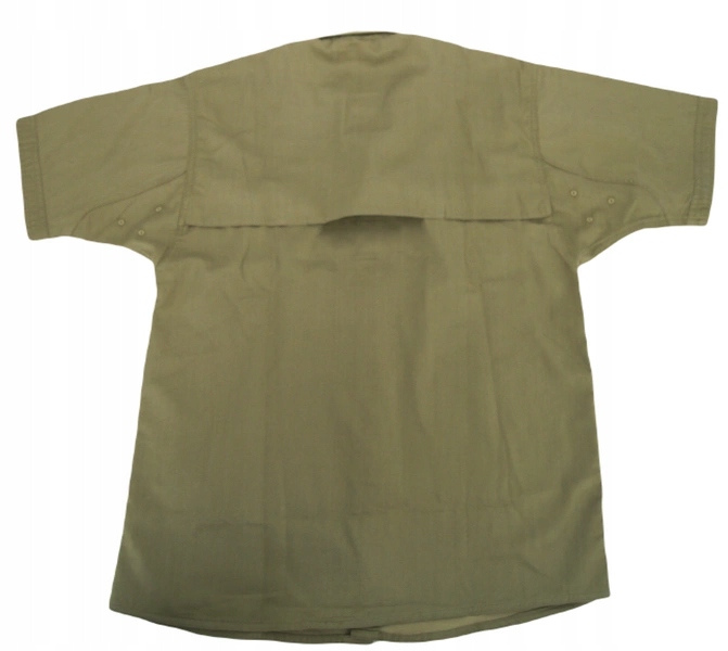 Рубашка застегивается на восемь пуговиц, расположенных на складке. Рукава отделаны складками. Под каждым рукавом имеется шесть вентиляционных отверстий. Спинка рубашки разделена и открыта для лучшей вентиляции. Оливковый цвет.