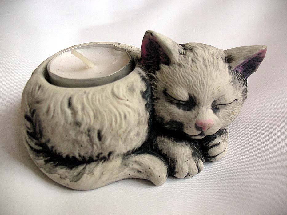 Кот - спящий котенок со свечой - керамическая статуэтка - 5 х 11 х 8 см.