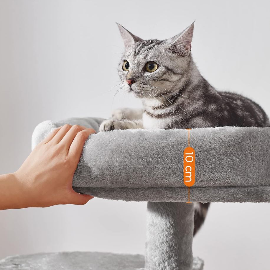 ▶ Когтеточка оснащена различными платформами, отделениями для хранения вещей и подвесными игрушками, которые стимулируют вашу кошку играть, поддерживая ее физическую активность и умственную стимуляцию.