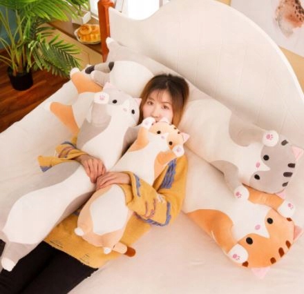 Плюшевый длинный кот может послужить прекрасным украшением детской комнаты и удачно превратиться в мягкого плюшевого мишку игрушка в мгновение ока, подушка или подголовник.
