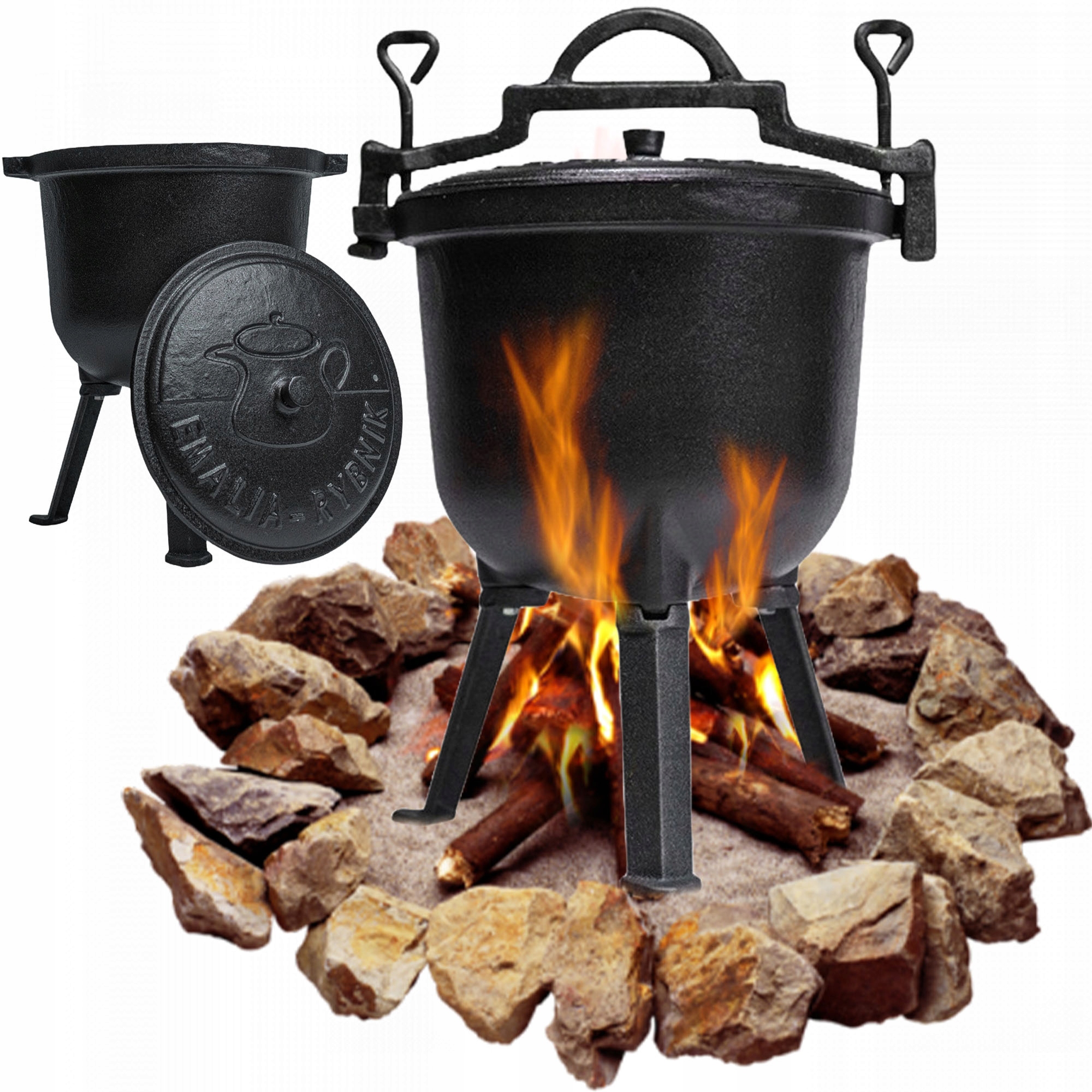 Это гарантирует длительное сохранение формы и дно не выпирает. Котел может стоять прямо на огне или подвешиваться над огнем. У него съемные ножки, что упрощает его использование на различных типах плит и горелок.