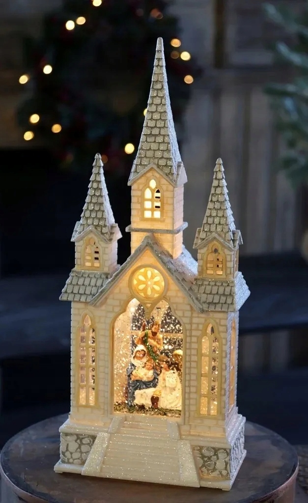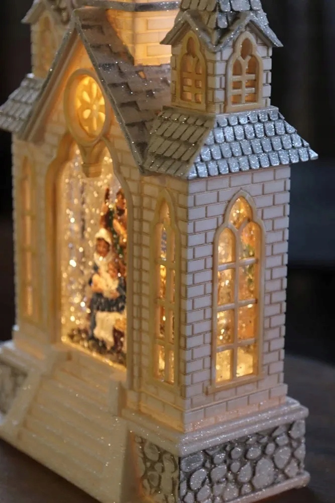 Внутри церковной башни традиционный вертеп в кружащемся блеске. Башня с реалистичной черепицей, белая церковь с легким блеском. Когда включен обогрев, Светодиод освещает рождественские фигурки и кружащиеся блестки, придавая нашему водному фонарю причудливый вид в предпраздничный сезон.