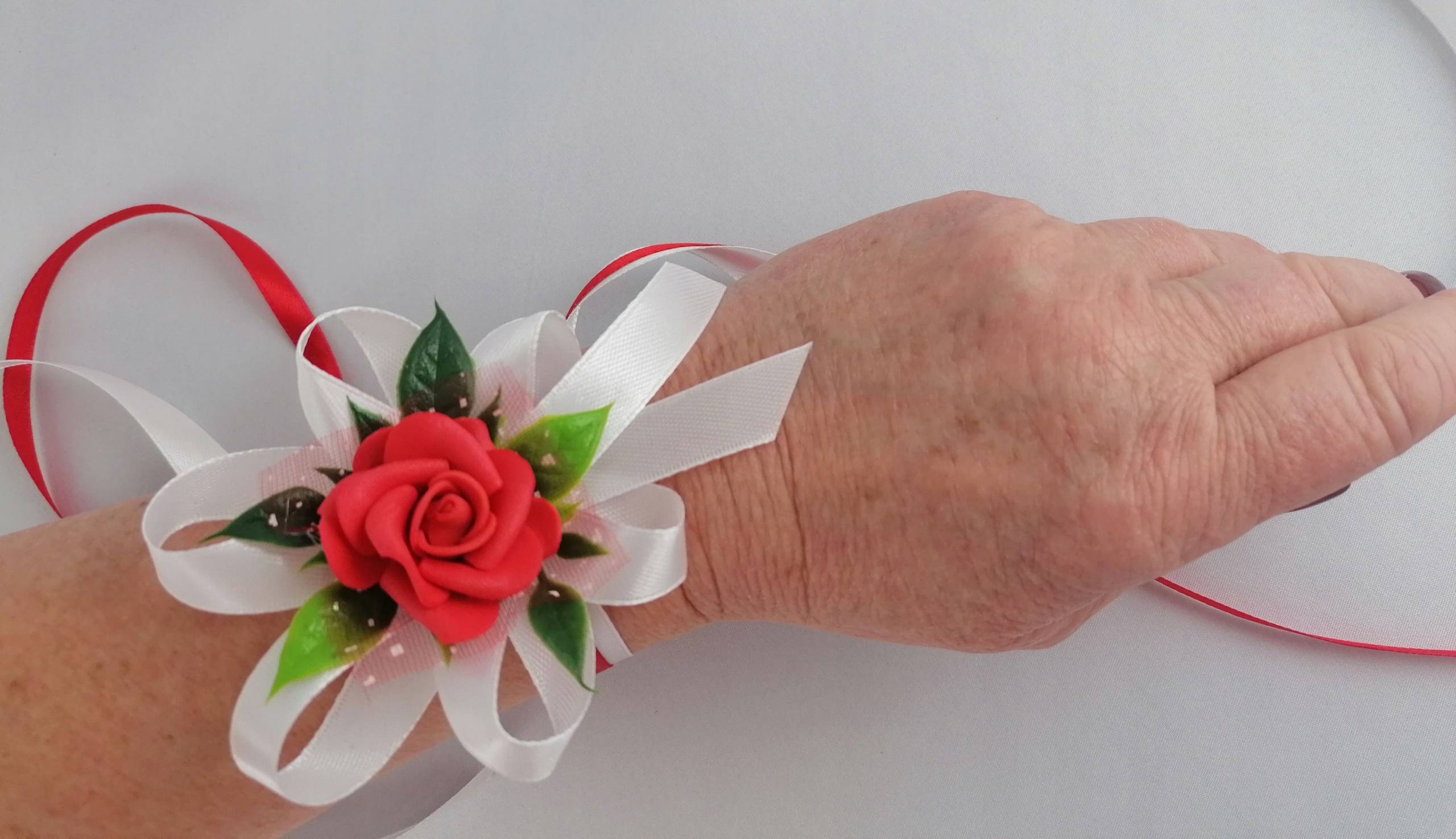 - красный цветок крепится на атласные ленты /12 и 6 мм белый, красный/
