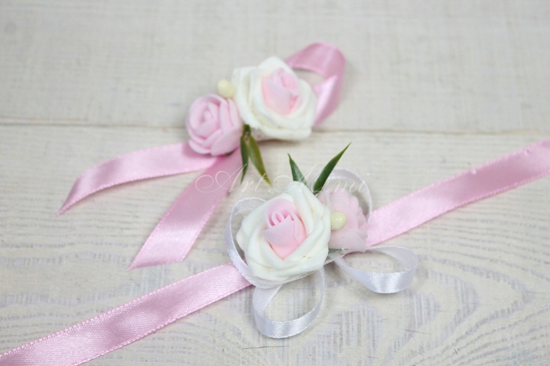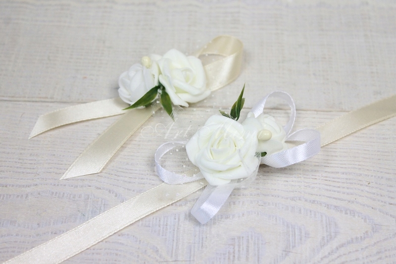 Изготовлен из роз, украшен с тюлем, жемчугом и декоративной травкой, все застегивается на атласные ленты.