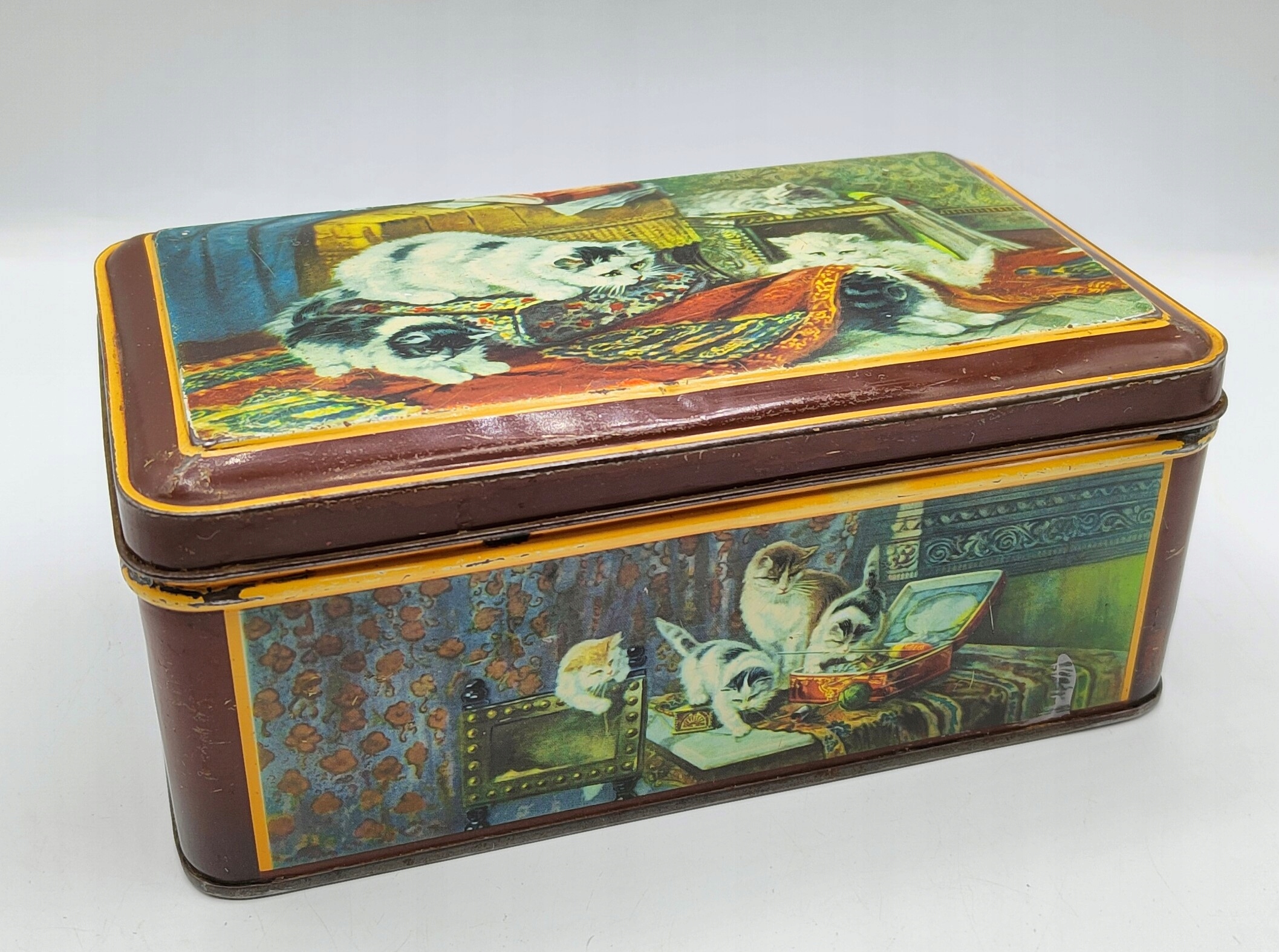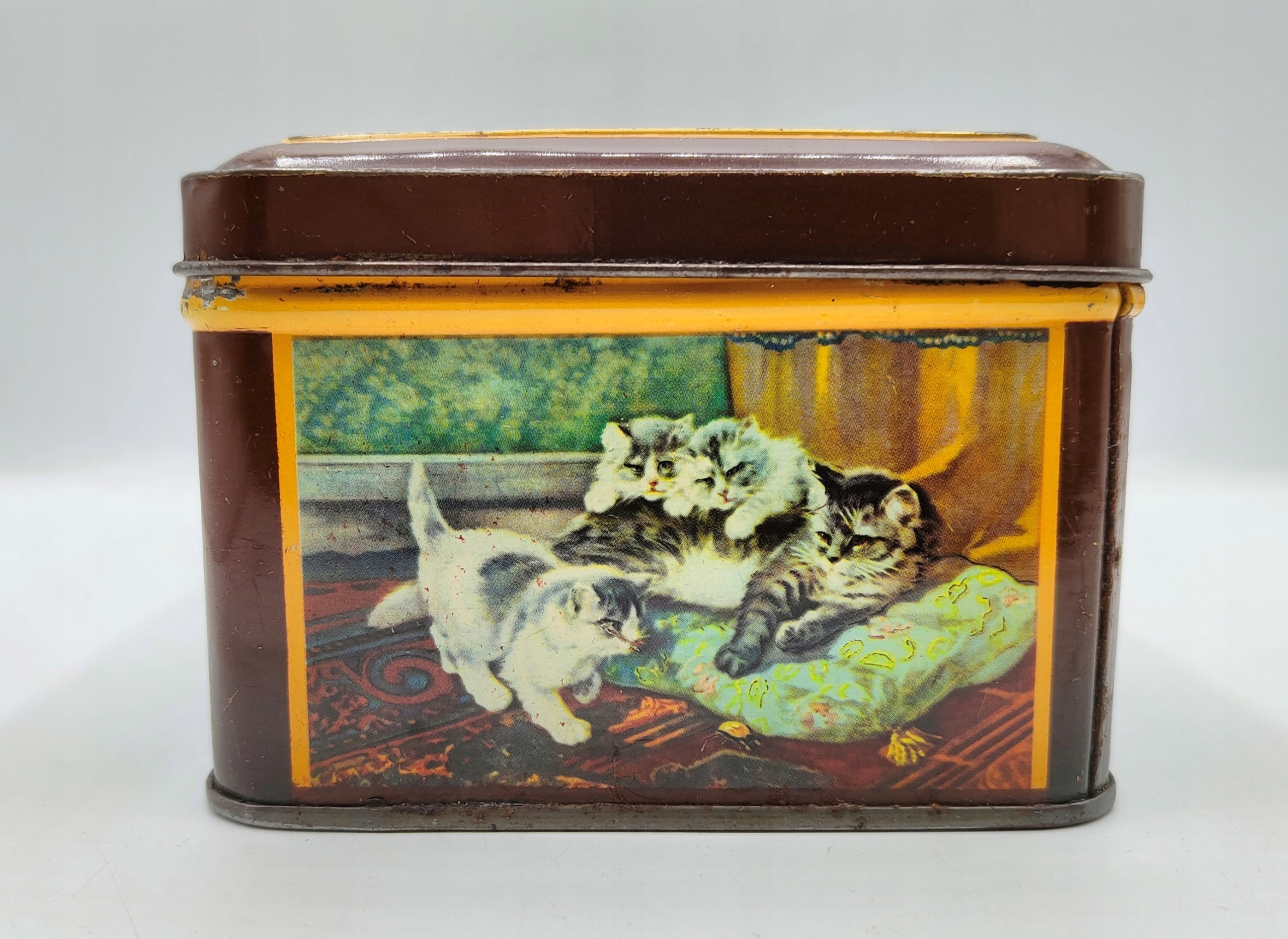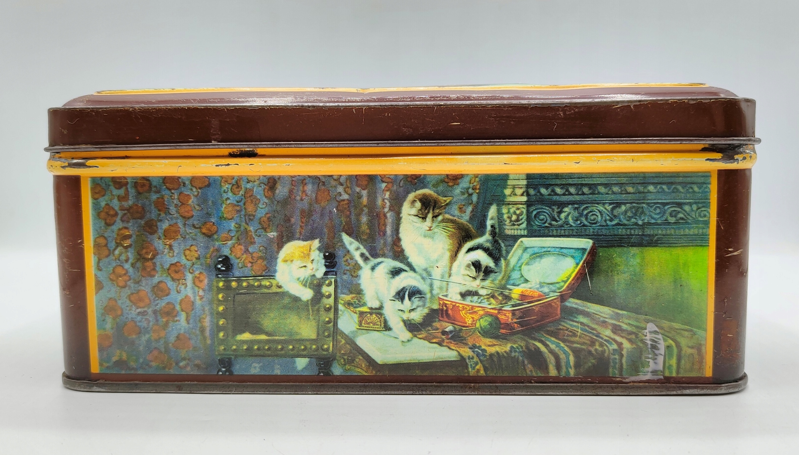 - предмет очень старый и его видно, кое-где есть вмятины, царапины, следы коррозии, но то есть это только добавляет шарма банке, все дополняется красивыми старыми фотографиями играющих котов,