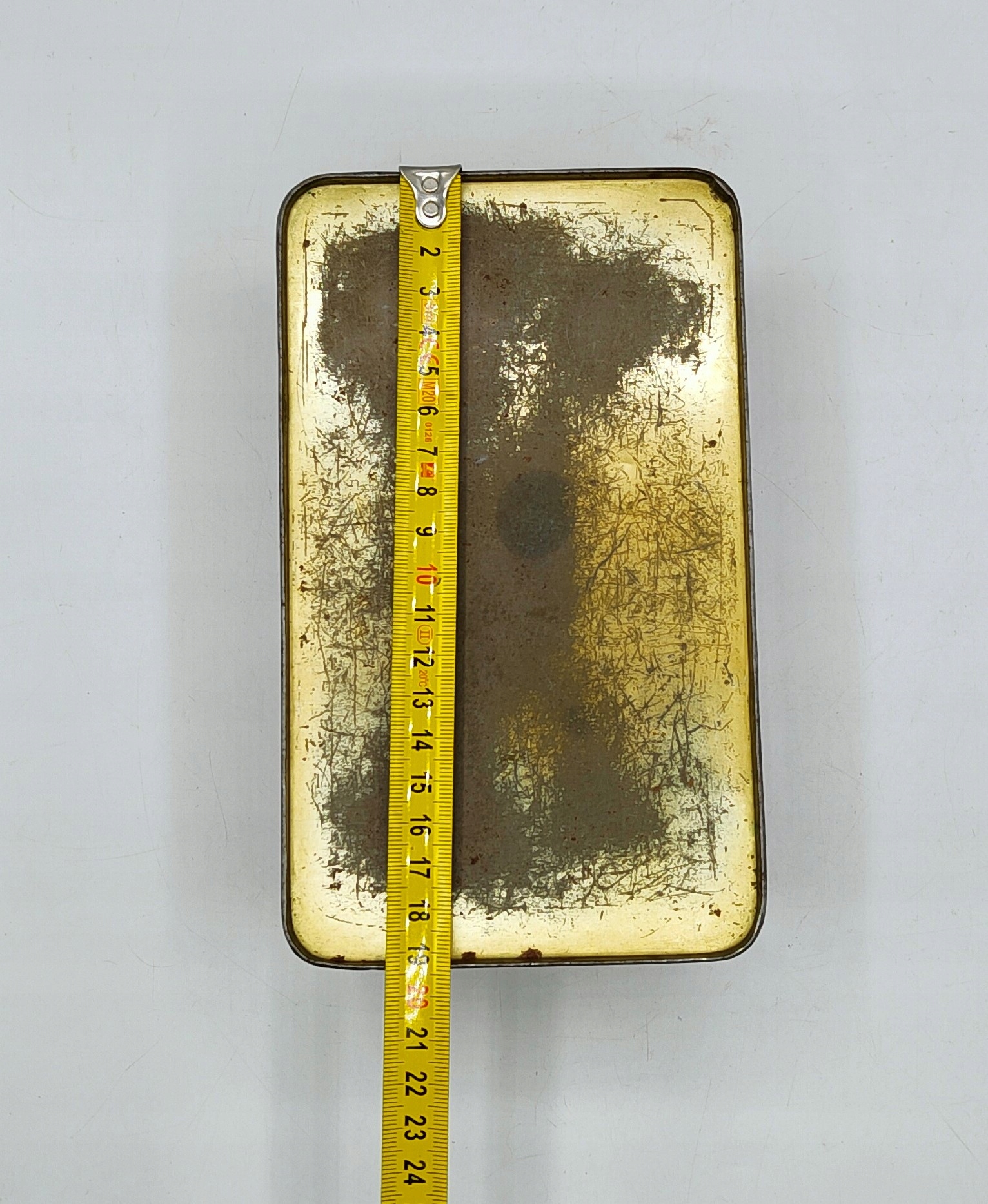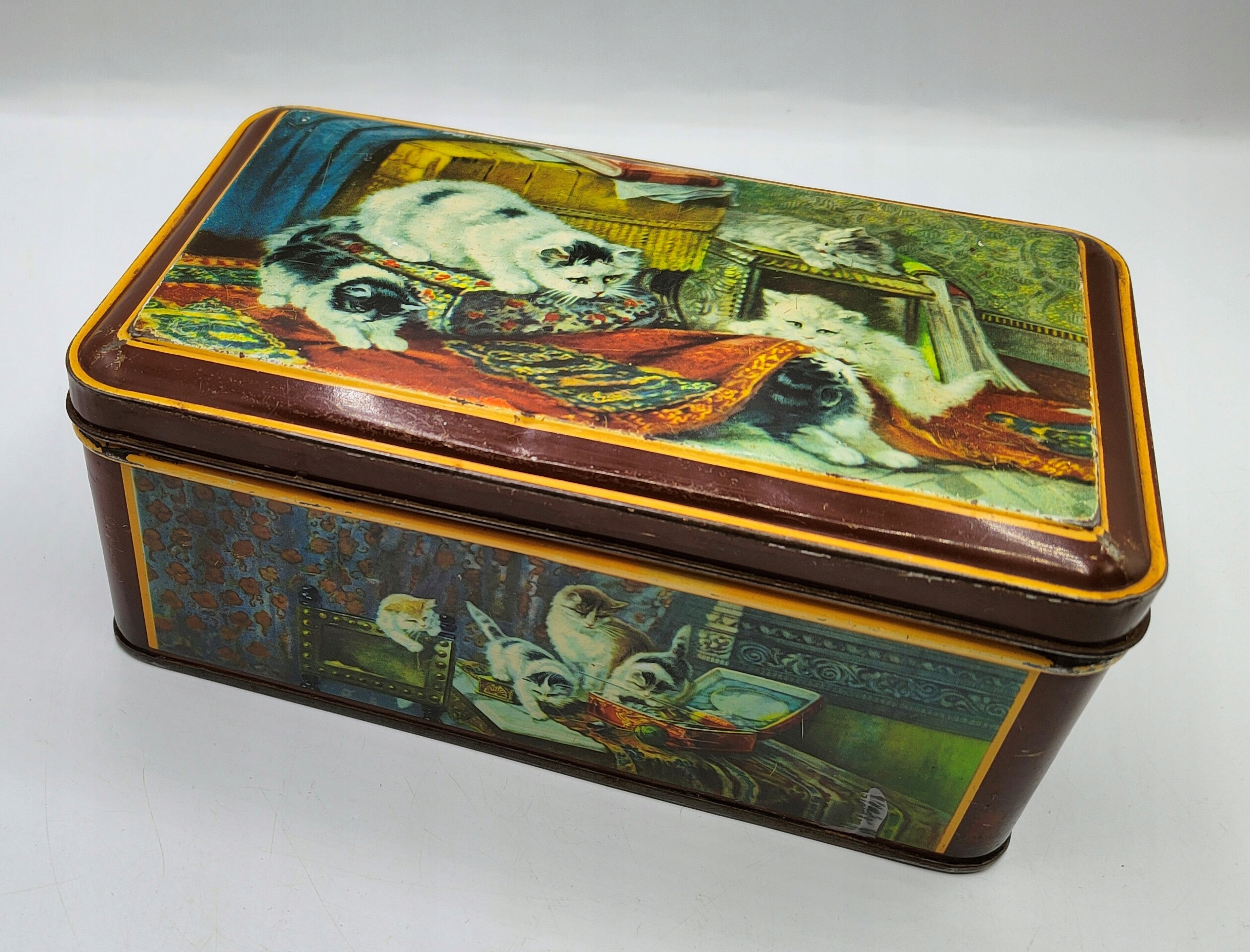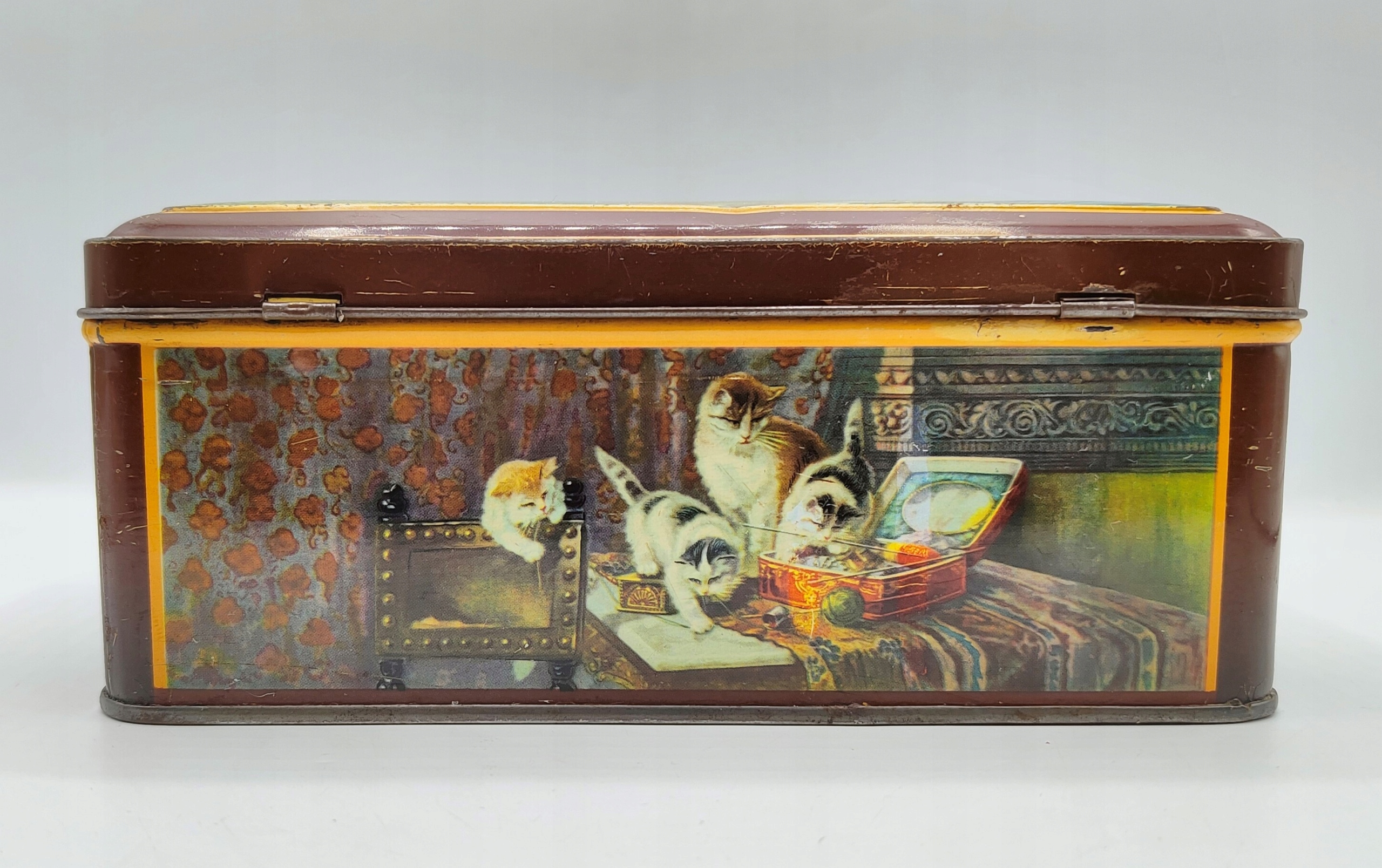 - предмет очень старый и его видно, кое-где есть вмятины, царапины, следы коррозии, но то есть это только добавляет шарма банке, все дополняется красивыми старыми фотографиями играющих котов,