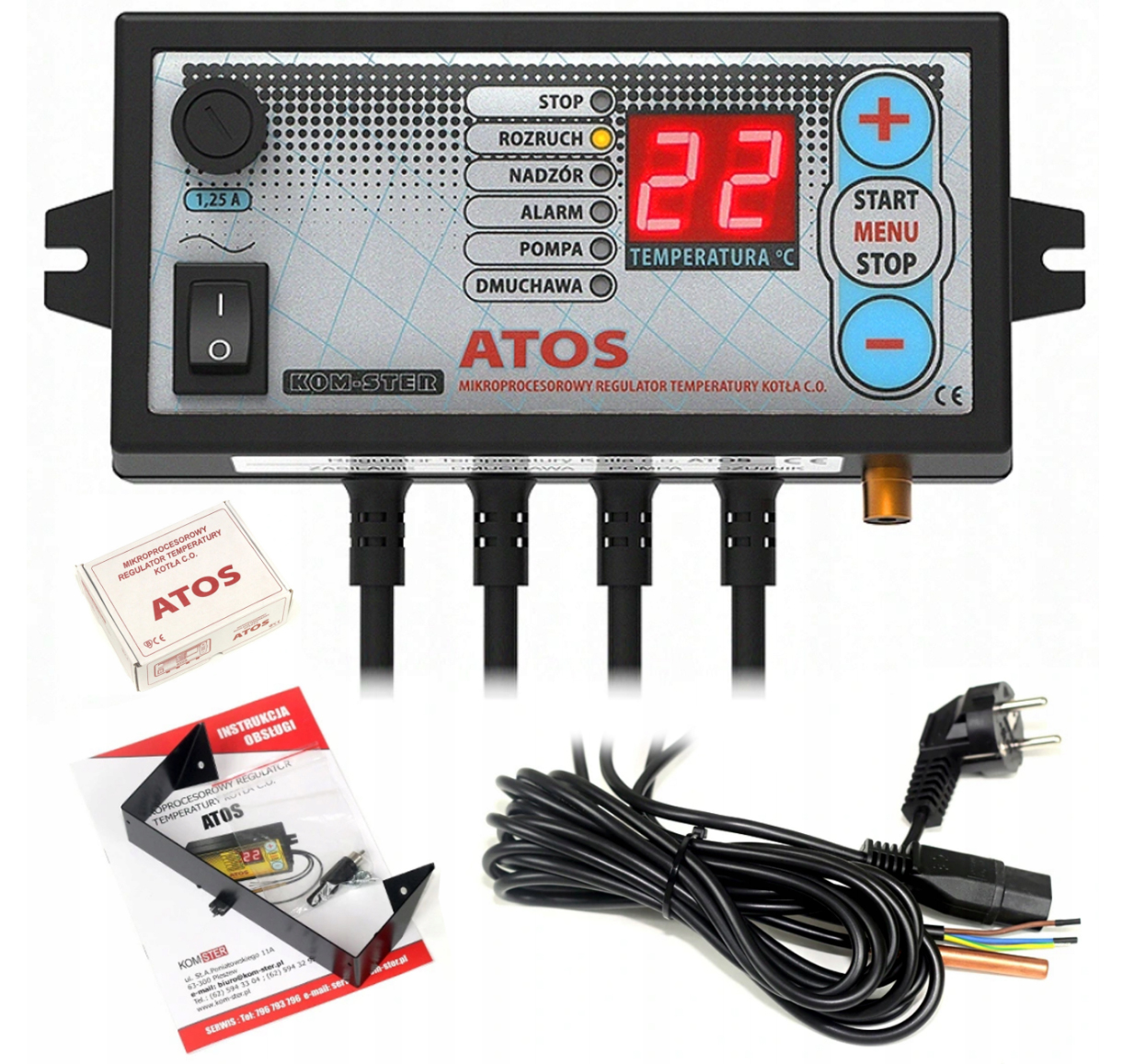 Контроллер Atos предназначен для управления вентилятором в котлах центрального отопления. и для включения циркуляционного насоса. Оснащен дополнительным выходом, позволяющим подключить комнатный термостат, а также позволяет поддерживать заданную температуру в помещении. Контроллер имеет множество практических функций. Он отличается простотой эксплуатации и надежностью.