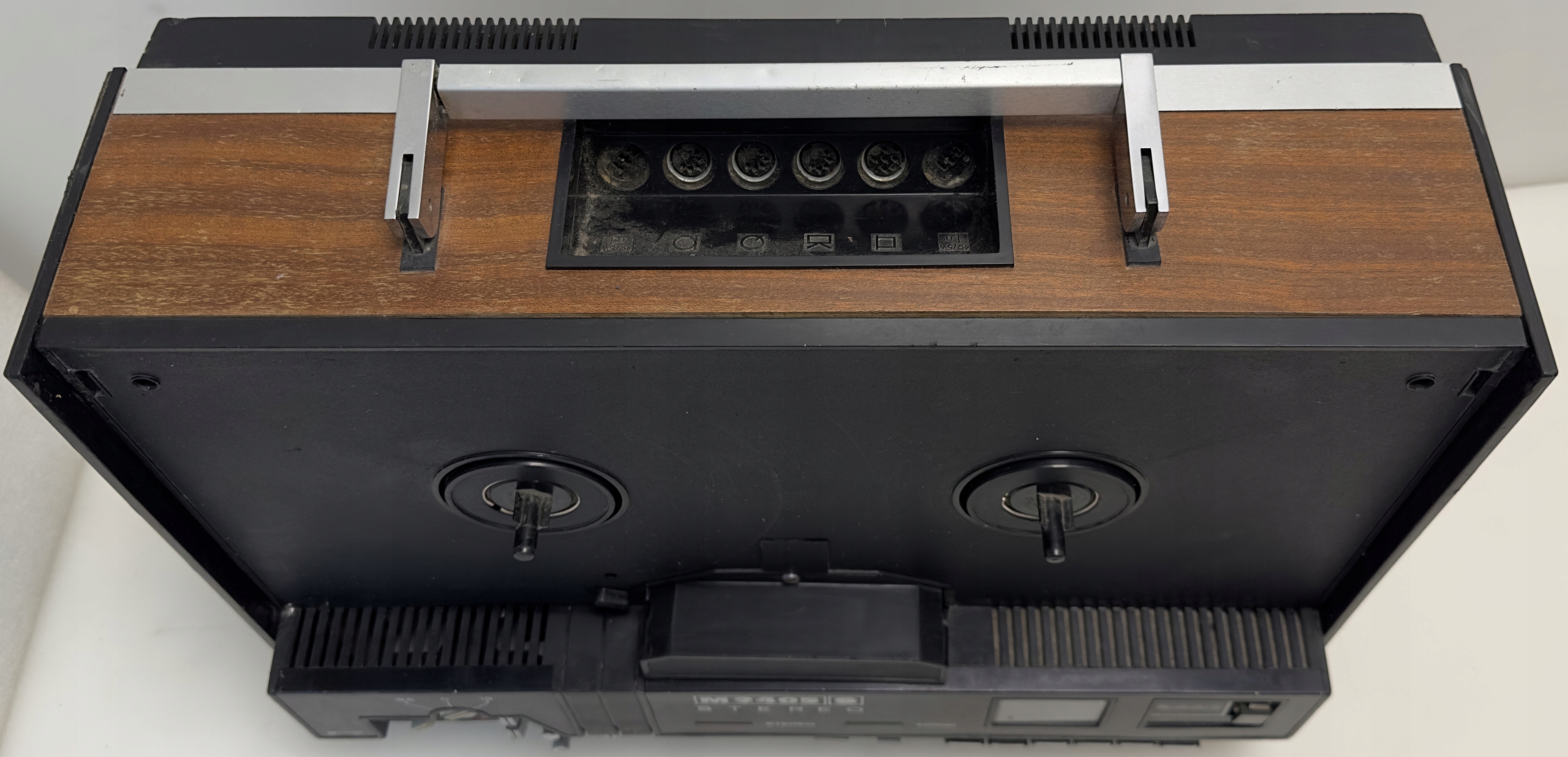 ТЕХНИЧЕСКОЕ СОСТОЯНИЕ - При включении слышен скрип (вероятно, двигателя). Мотору может потребоваться регулировка скорости. Левая катушка застревает и лента из-за этого прыгает. Счетчик не вращается. Динамики звучат очень хорошо. Нет крючков для чехла. Индикаторная подсветка работает.