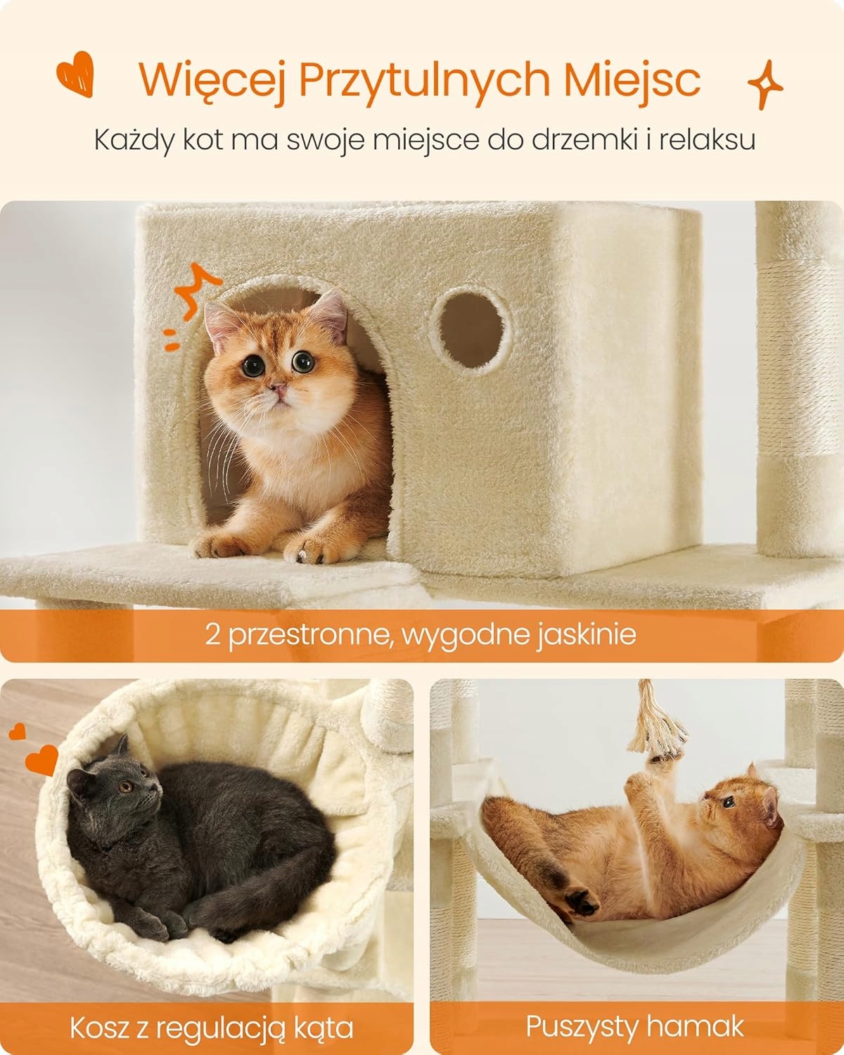 2 мягкие платформы, 2 уютные пещеры, 1 пушистая корзина, 2 плюшевых мяча и 1 гамак – каждая кошка найдет свое любимое место на этой многоэтажной когтеточке – идеально подходит для домов, в которых живут несколько кошек.