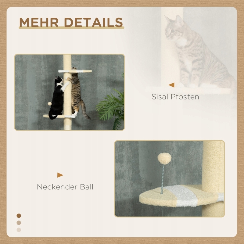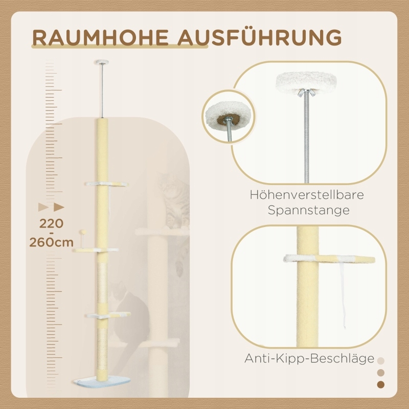 От пола до потолка: впечатляющая кошачья когтеточка высотой от 220 до 260 см. Правильно сжатая натяжная тяга обеспечивает стабильность и долговечность. Кошки могут безопасно прыгать и лазить. Оборудовано несколькими местами для отдыха.