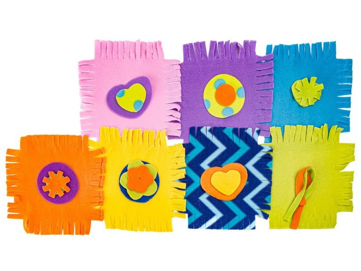 Состав набора: Кусочки ткани с бахромой разных цветов, Дополнительные элементы для декора.