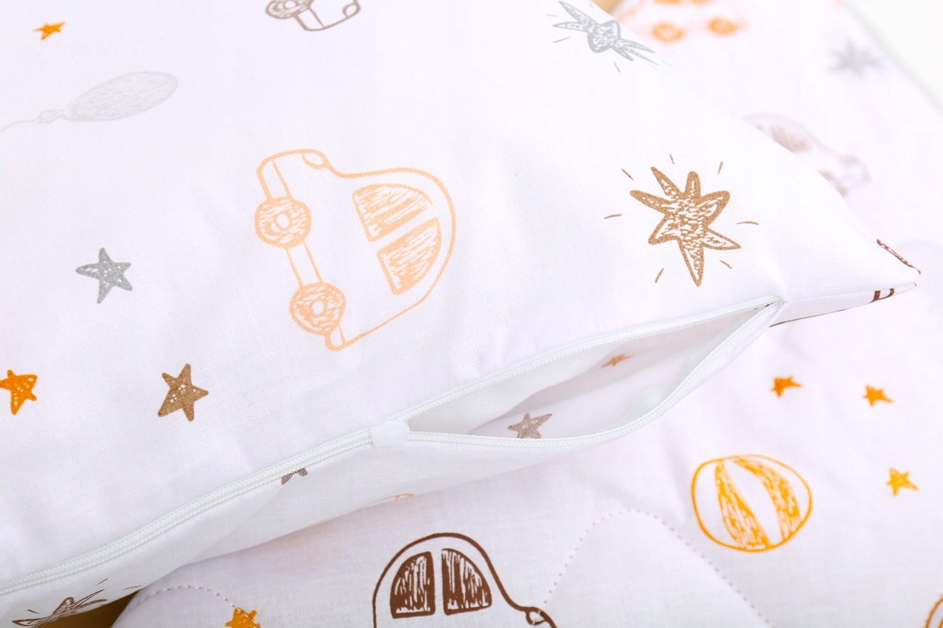 ● подушка 40x40 см - с анти -аллергической вставкой и наволочкой, закрепленной на молнии (легкое удаление и промывание). Стеганое одеяло 100x145 смг - большой, мягкий и уютный. Ребенок может спать посередине, как в спальном мешке или накрыть себя, как традиционное одеяло.