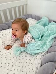 Наш вязаный глупый на ощупь - красивое одеяло, оберните малыша во время прогулки или во время сна. Это будет работать с первых моментов жизни ребенка, потому что он не будет раздражать его нежную кожу из естественных тканей. Благодаря правильному материалу, малыш спит спокойно, и его кожа может дышать.