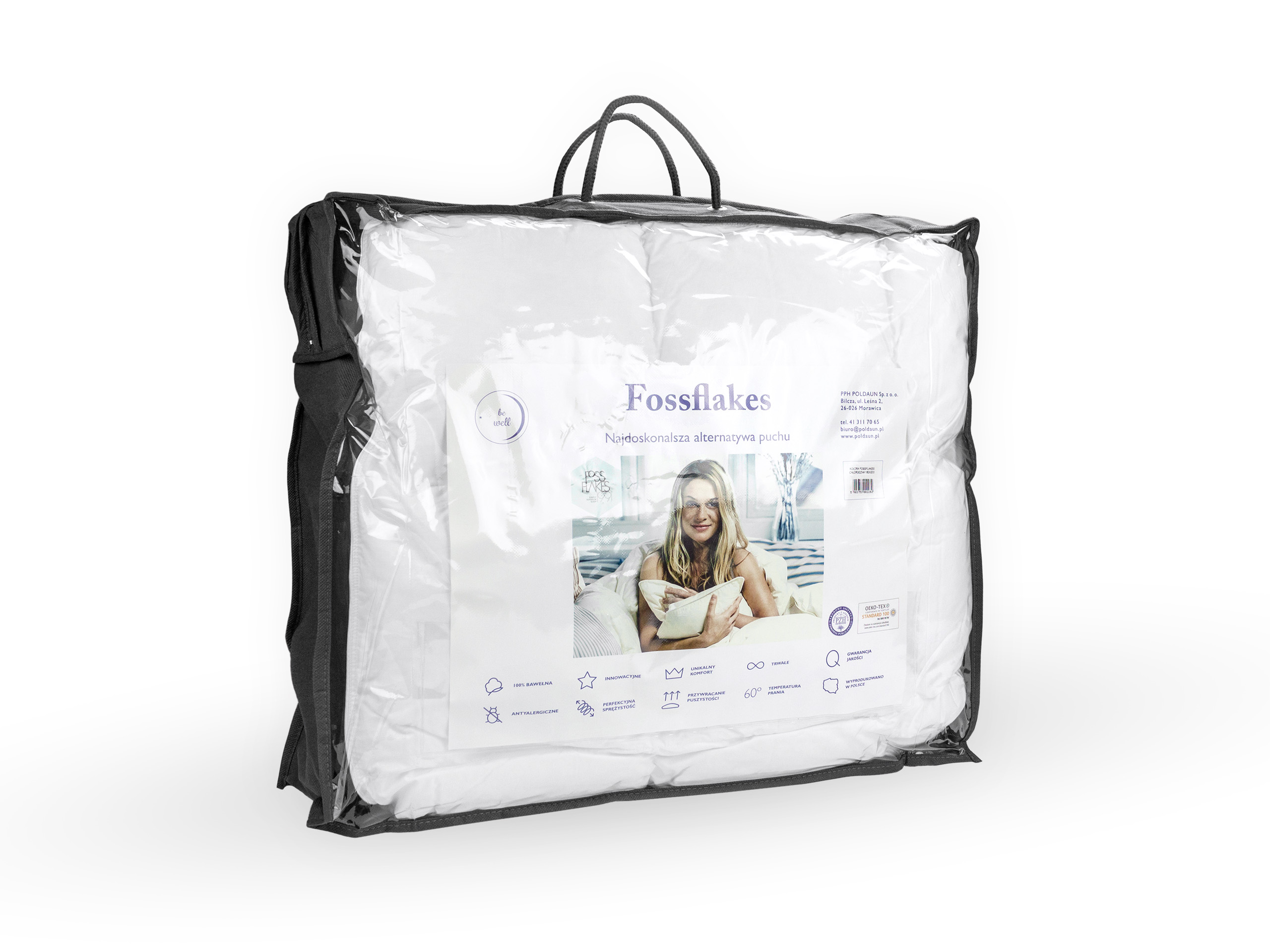 Одеяла с наполнителем Fossflakes , который был изобретен и запатентован в Дании. Инновационный синтетический наполнитель, по структуре напоминающий мягкие и нежные снежинки, что делает его отличной альтернативой пуху. Изделия Fossflakes можно стирать столько раз, сколько необходимо, чтобы они оставались чистыми и их форма никак не менялась. Одеяла остаются пушистыми и эластичными даже после длительного использования.