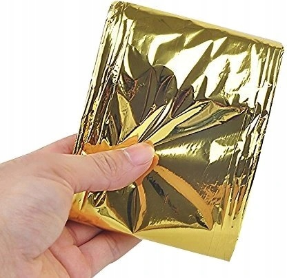 ► Одеяло выполнено из тонкого металлизированного полиэстера фольга, с одной стороны серебристого цвета, а с другой стороны золотого.