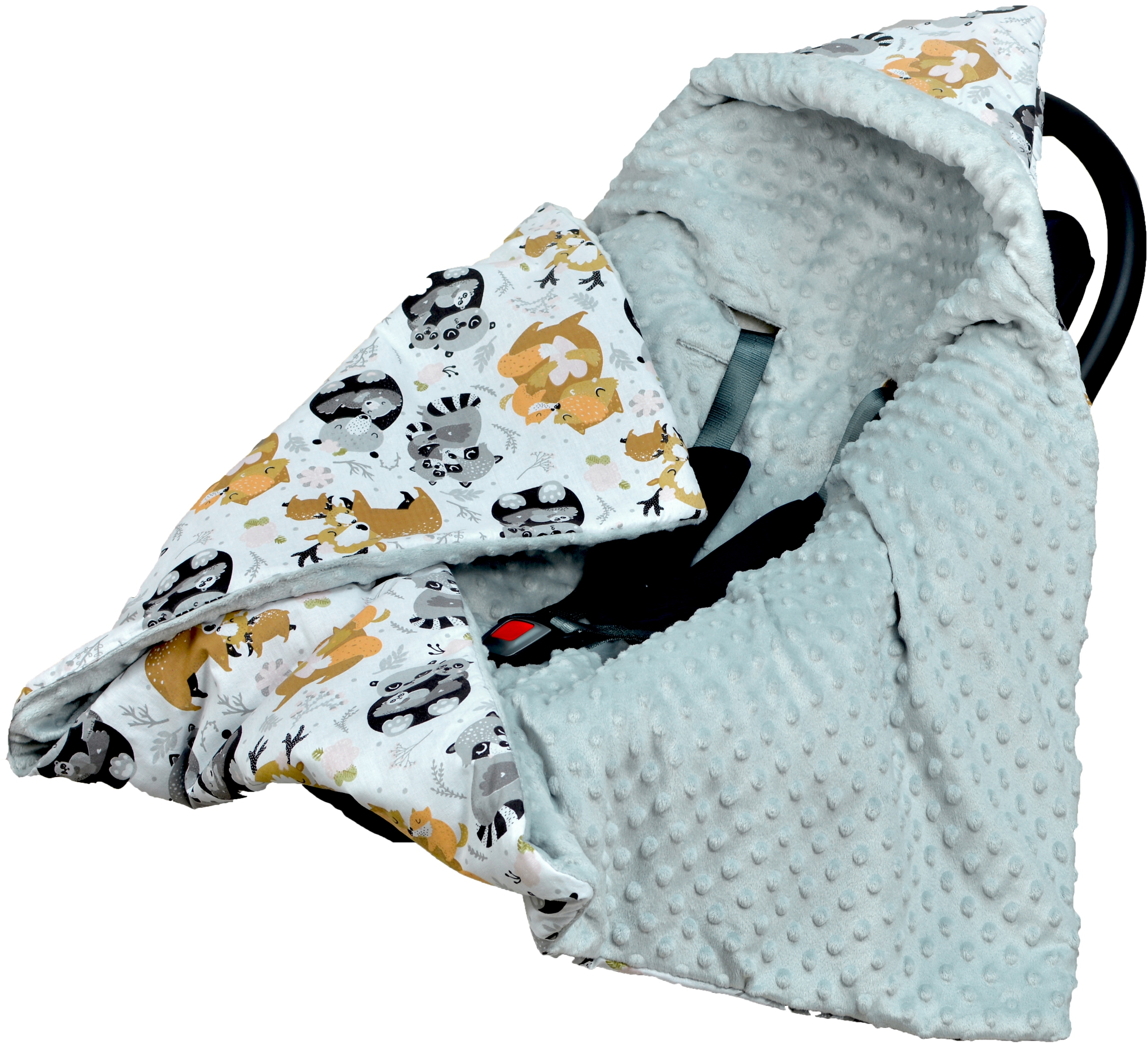 Мягкое одеяло, идеально подходящее для переноски, имеет 5 отверстий для ремней и капюшон. Двустороннее одеяло, одна сторона из 100% принтованного хлопка, другая из мягкой норки. Внутреннее пространство наполнено силиконовым нетканым материалом. Одеяло можно стирать при 30 градусах и гладить на хлопковой стороне.Размеры 90х90хм (+- 3см)