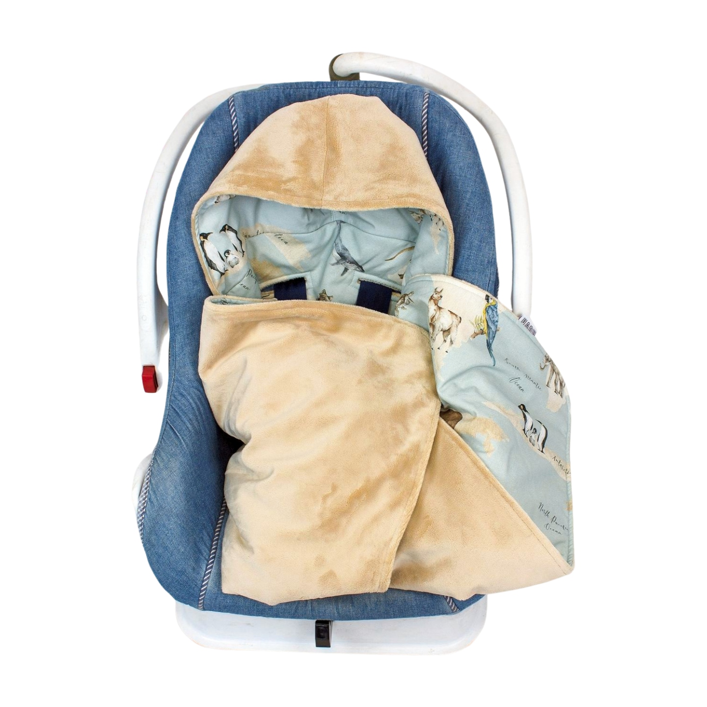 У одеяла отверстия, через которые проходят пояса. Ребенка можно положить в автомобильное сиденье, одетое, но без толстой куртки или комбинезона, закрепите жгут и одевайте одеялом. Когда машина нагревается, вы можете наклонить одеяло движением одной руки. При удалении носителя из машины одеяло плотно обернуто в малыша, которого достаточно, чтобы надеть шляпу, и одеяло, специально предназначенное для защиты от ветра.