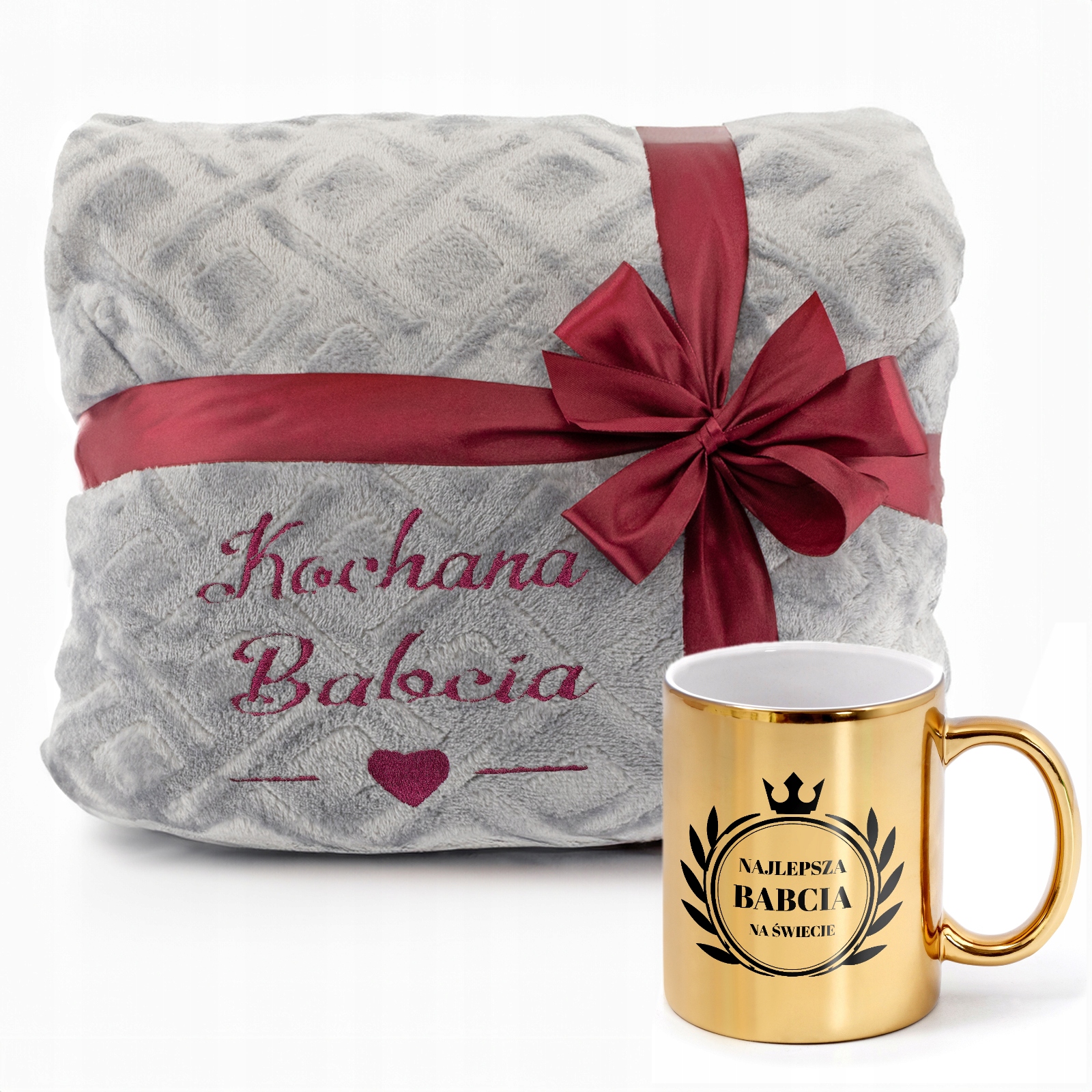 Именный плед с вышивкой-посвящением + золотая кружка в подарок бабушке