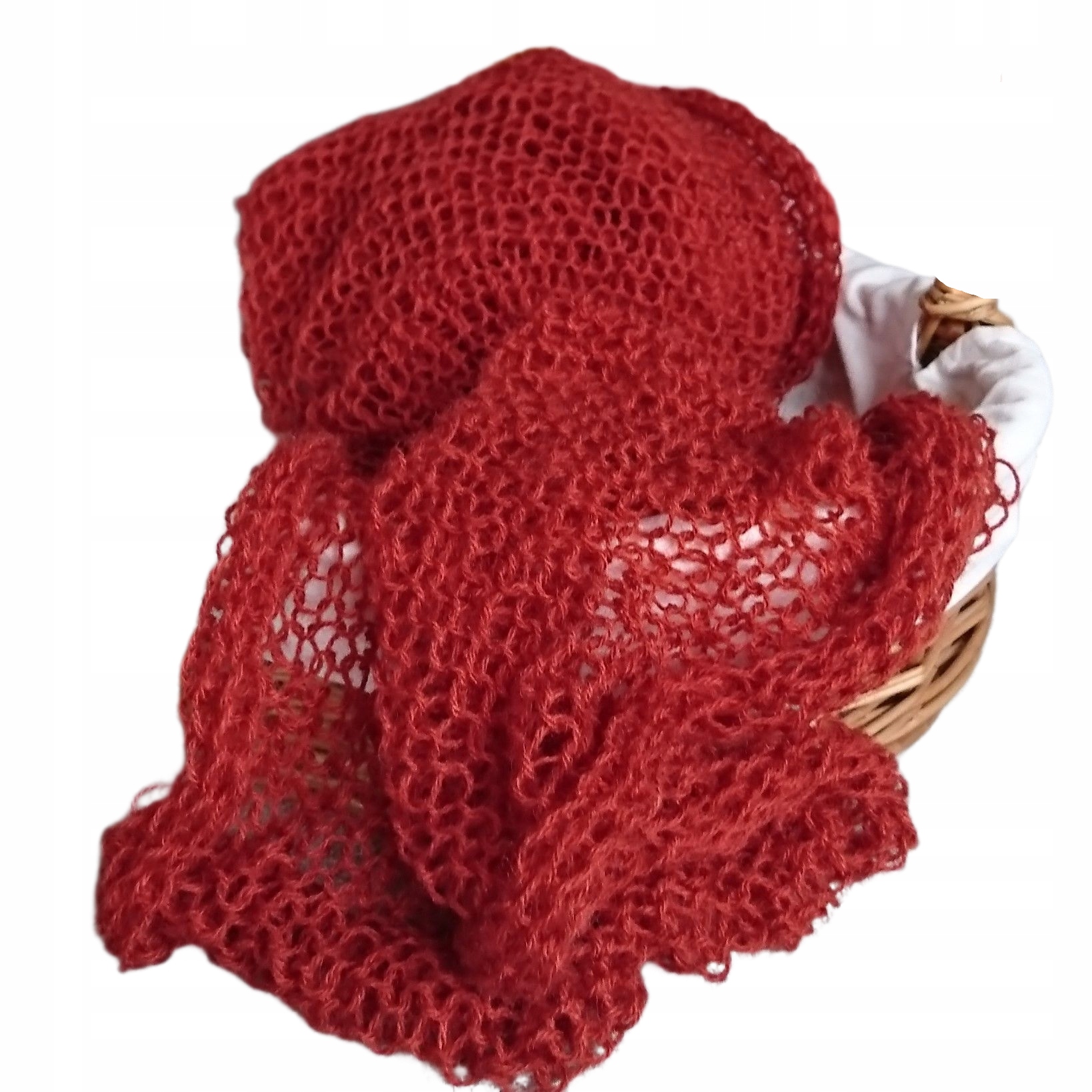 Одеяло/пеленка ручной работы в нашей мастерской для занятий с новорожденными. Обертка выполнена из ангорской пряжи кирпично-красного цвета. Пряжа приятная на ощупь, с очень нежным ворсом. Одеяло выполнено из довольно рыхлого плетения, что придает ему эффект «тумана», оно очень гибкое.