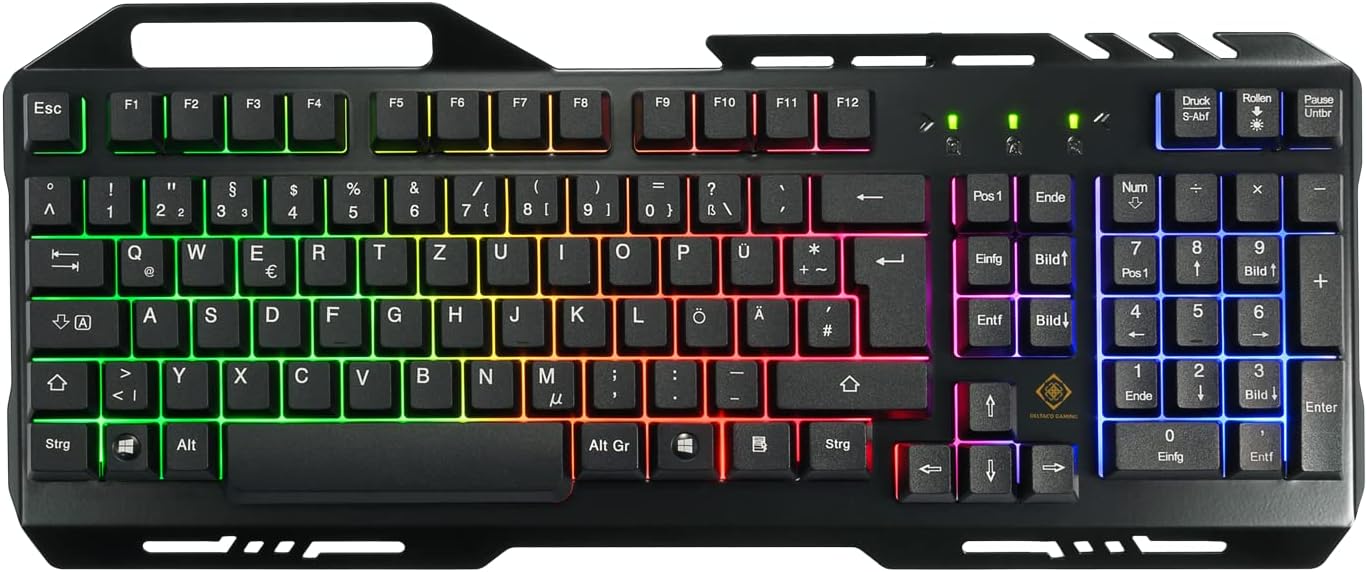 Клавиатура оснащена плоскими клавишами на мембранном переключателе, раскладкой PAN-Nordic и защитой от ореолов. Он имеет оцинкованную черную металлическую пластину, которая придает клавиатуре солидный вид и придает ей большую устойчивость и вес. Для RGB-подсветки постоянно установлен «режим радуги», и его можно включить или выключить, нажав кнопку Scroll-Lock.