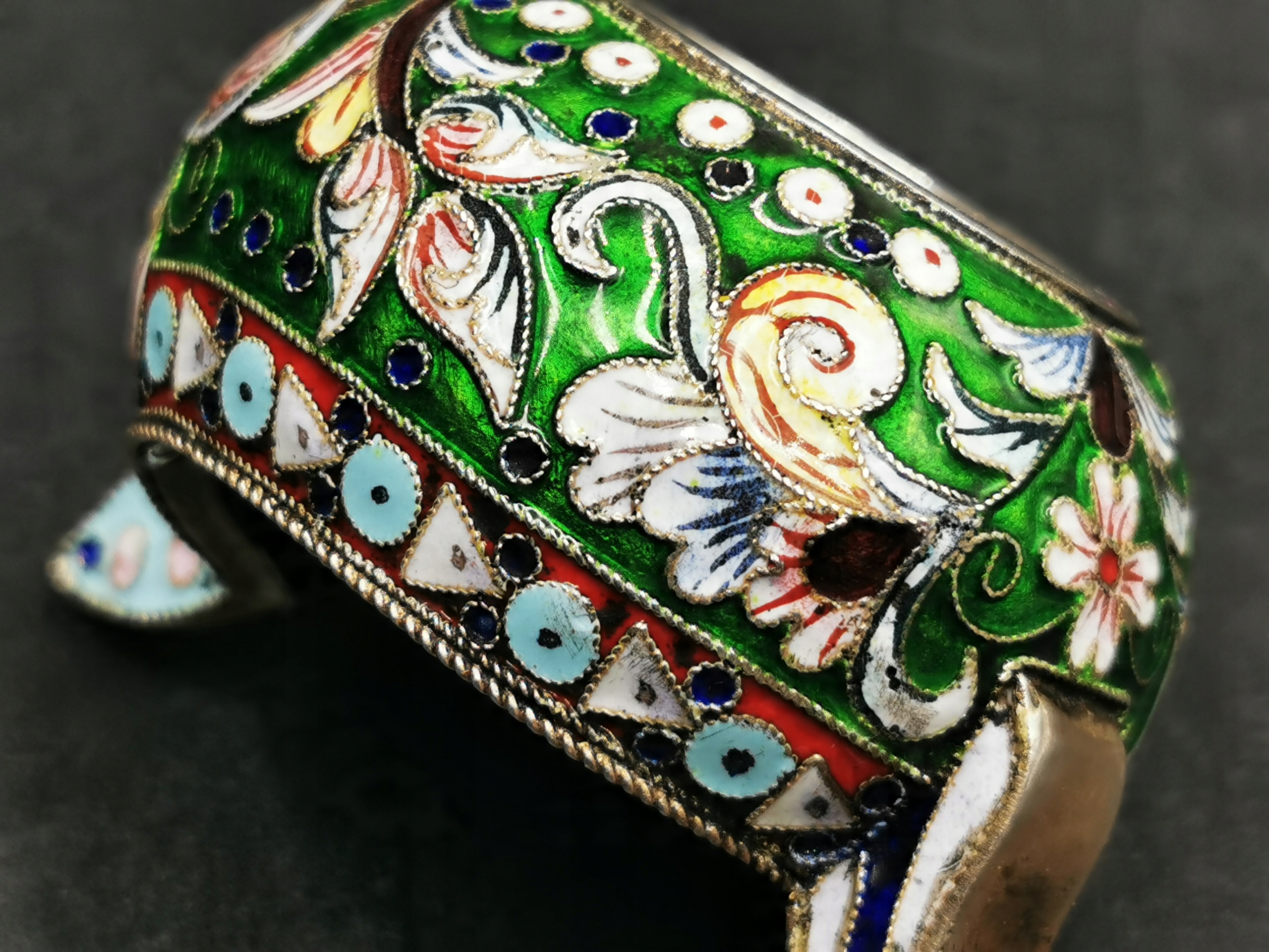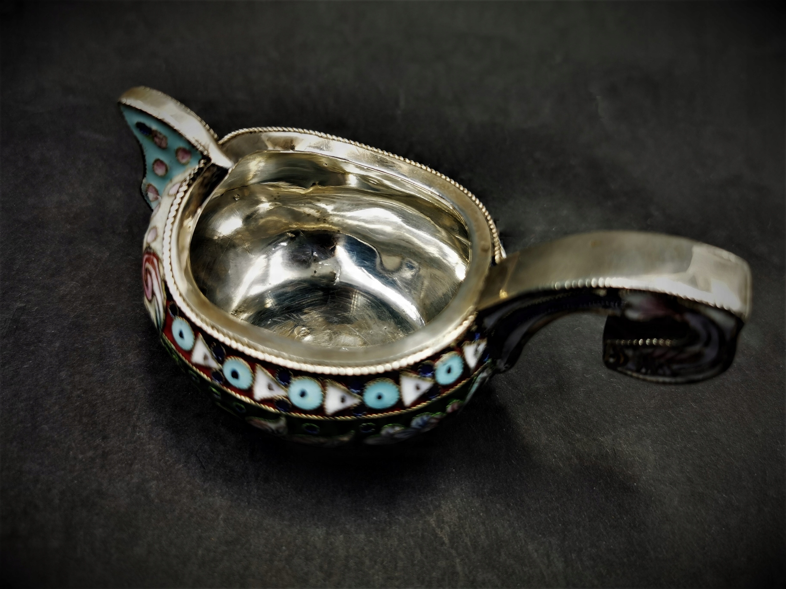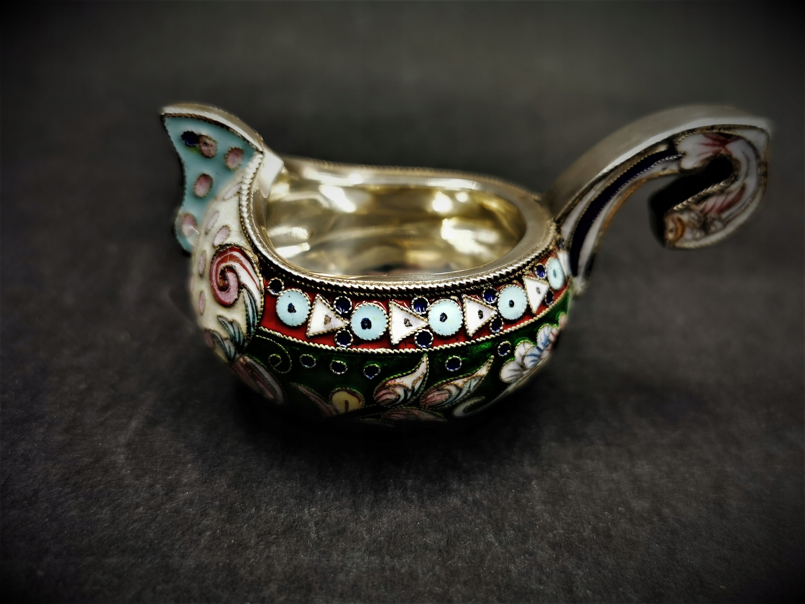 Представляем вам феноменальный классный предмет из Царской России. Ковш — небольшой сосуд, в котором пьют водку или мед, взятый из такого же сосуда большего размера. Тот, что мы имеем, относится к концу XIX - началу XX века, с видимым проколом в овальном поле, голова женщины в профиль, обращена влево, на голове чепчик, с левой стороны имеется цифра 84 - обозначающая пробу серебра (84 золотника), за головкой женская греческая буква (вероятно, Пи, вторая плохо читаема), закрепленная за Пробирной палатой в Москве, рядом со второй точкой в На четырехстороннем поле - инициалы ювелира - Павлов.Как правило, ковш - это деревянный ковш для меда, вина или водки. В царской России также изготавливали роскошные серебряные ковши, которые были подарками царя в награду за заслуги перед монархом.Сосуд очаровывает своими красками и мастерством исполнения. Полностью украшен цветной ячеистой эмалью (самый сложный тип изготовления) с цветочными и геометрическими мотивами.