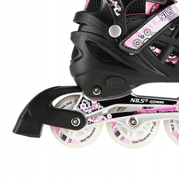 Роликовые коньки NH10905 — это настоящее удовольствие от катания. Благодаря возможности перемещения дополнительного колеса на заднюю ось роликовые коньки функционально трансформируются в роликовые коньки. Данное решение поможет самым юным фигуристам сделать первые шаги в этом виде спорта. В свою очередь, установка дополнительного колеса на переднюю ось превращает изделие в роликовые коньки. Роликовые коньки оснащены специальными алюминиевыми полозьями и тормозом, что обеспечивает безопасность во время катания. В свою очередь, колеса и подшипники класса ABEC7 позволяют снизить сопротивление качению, то есть ускорить езду.