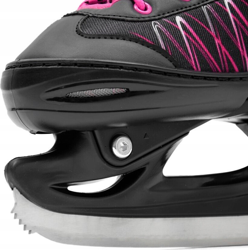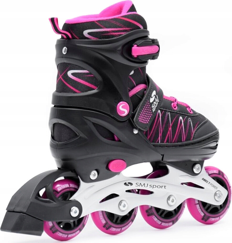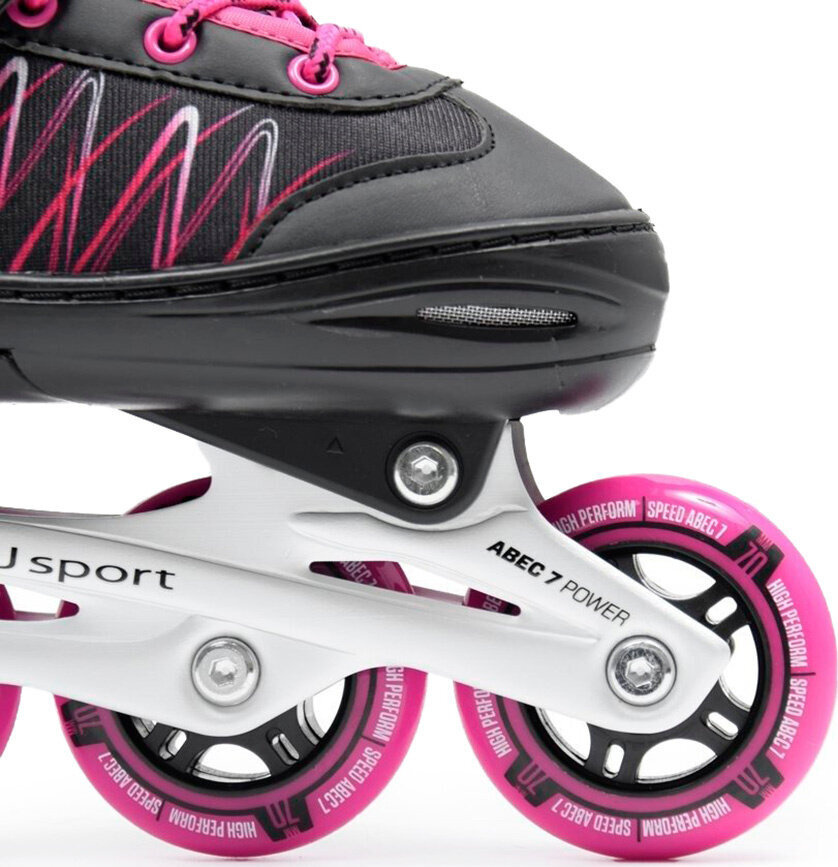 Модель, представляющая собой комбинацию коньков и роликовых коньков в черном и розовом исполнении, приобрела безопасную и очень простую возможность использования. регулировки размера без риска самопроизвольной регулировки.