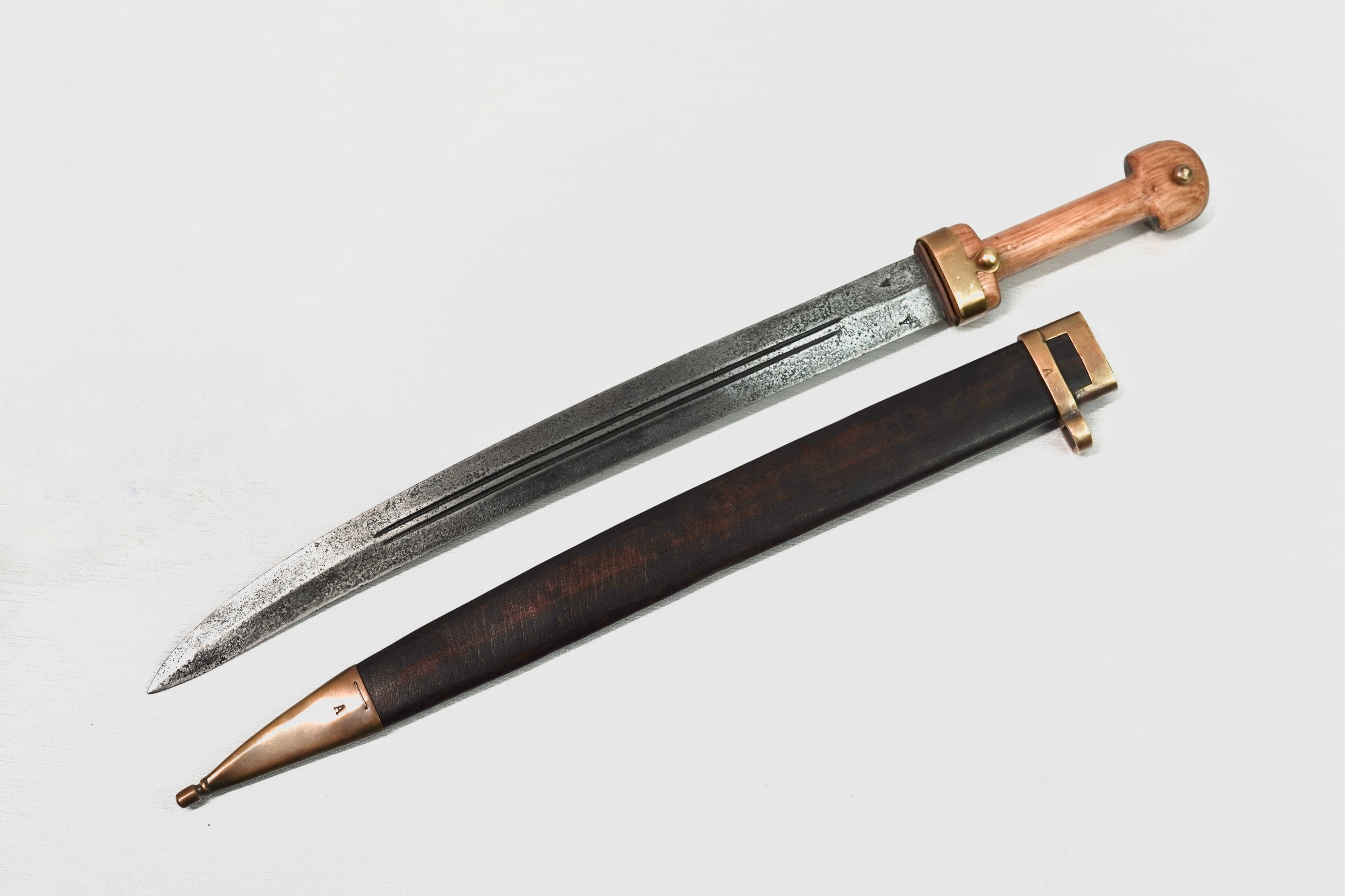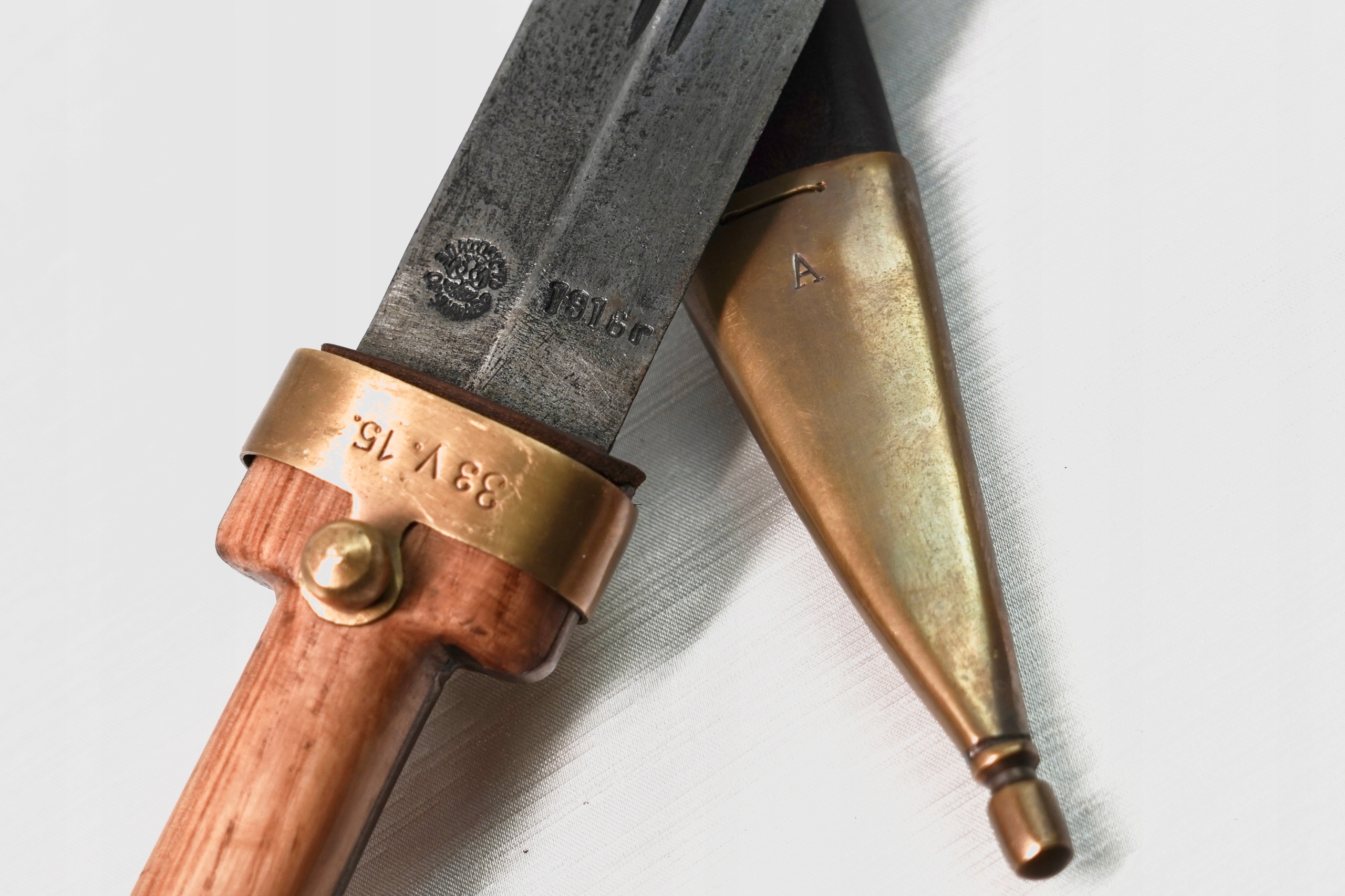 Представленный нами кинжал (длинный казачий нож) состарен на заводе с целью придания ему внешнего вида, максимально имитирующего старинный предмет. . Подпись возле места соединения лезвия и рукоятки. Имеется маркировка Златоустовской оружейной фабрики (Златоустовского оружейного завода) 1916 года выпуска, а с другой стороны две буквы А. Клинок изготовлен из высококачественной незакаленной стали. Деревянная ручка с латунными элементами. Ножны из лицевой кожи с латунной фурнитурой, также с тиснением буквы А.