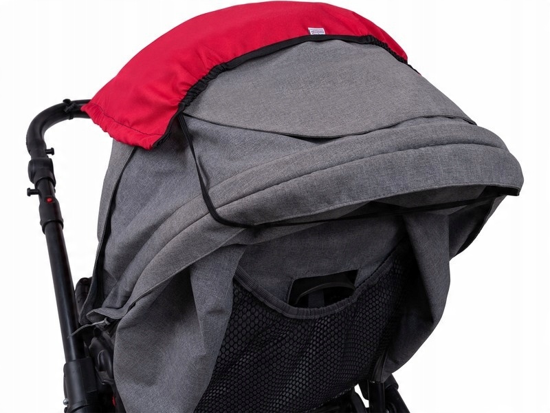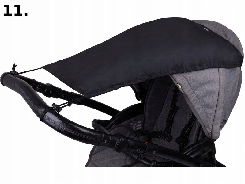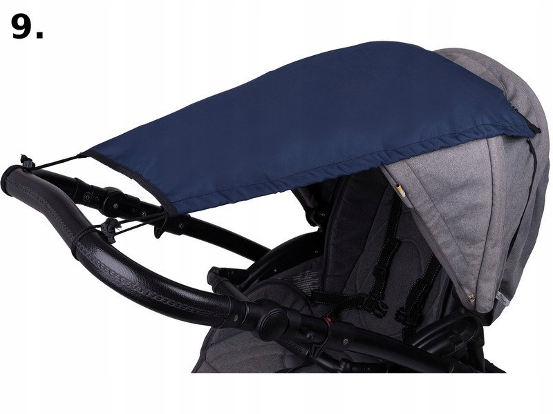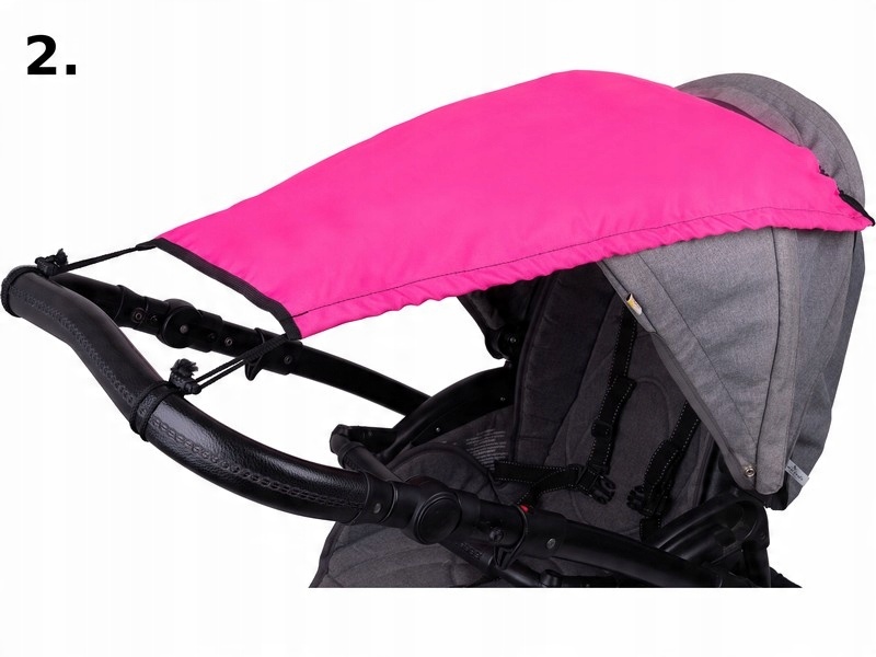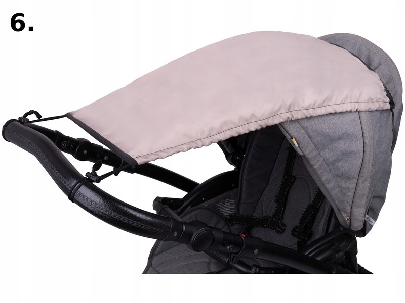 Навес крепится с помощью резинки, проходящей через него. Спереди он привязан двумя веревками к ручке коляски. Дополнительно козырек можно регулировать с помощью веревки и стопоров. В зависимости от угла падения солнечных лучей чехол можно сдвигать вбок, регулируя его с помощью веревочек и резинки.