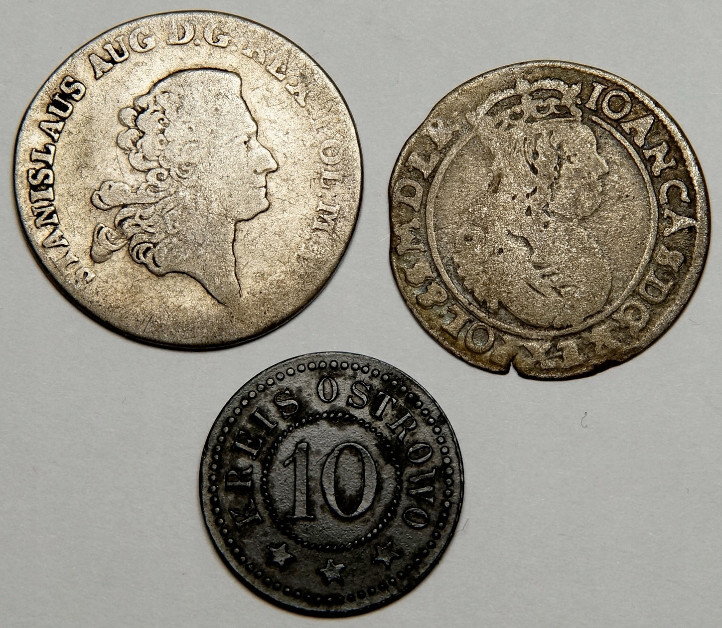 kp złotókwa Poniatowski, szóstak Jan II Kazimierz i 10 fenigów Ostrowo