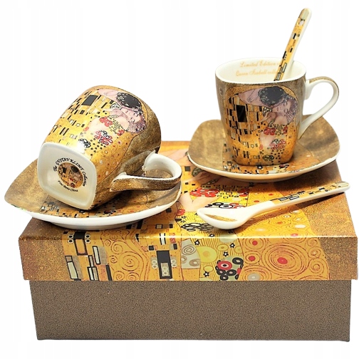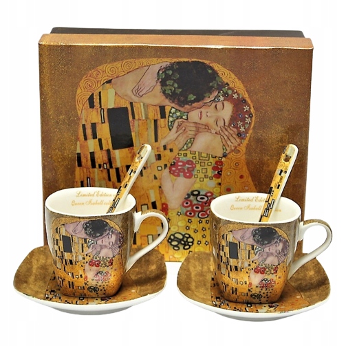Элегантный набор из 2 чашек, ложек и тарелок с мотивом картины «Поцелуй». Идеальный подарок для любителей творчества Густава Климта или модерна.