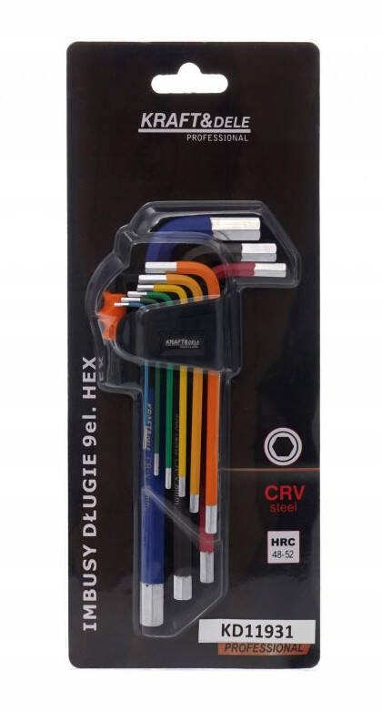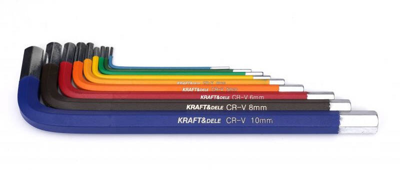 Набор разноцветных шестигранных ключей Kraft&Dele, модель KD11931, имеет специальный наконечник с адаптированным отверстием, совместимым с винтами с шестигранной головкой.